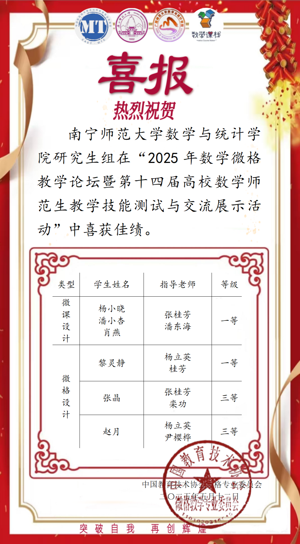 为全面贯彻落实《教育强国建设规划纲要(2024-2035年)》,推动人工智能技术与基础教育的深度整合,2025年数学微格教学论坛及第十四届高校数学师范生教学技能测试与交流展示活动于2025年5月9日至12日在广西师范大学育才校区顺利举办。比赛分为研究生、本科生两个赛道。华体会平台(中国)数学与统计学院学子在比赛中表现优异,参赛作品及选手全部获奖。其中,6名参加微格教学测试的选手分别获得一等奖、二等奖、三等奖各2项;4名参加数学微课比赛的作品分别获得一等奖2项,二等奖1项,三等奖1项;华体会平台(中国)被评为优秀组织单位。