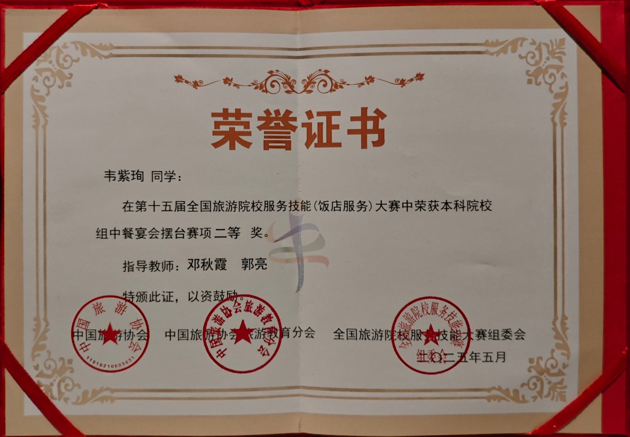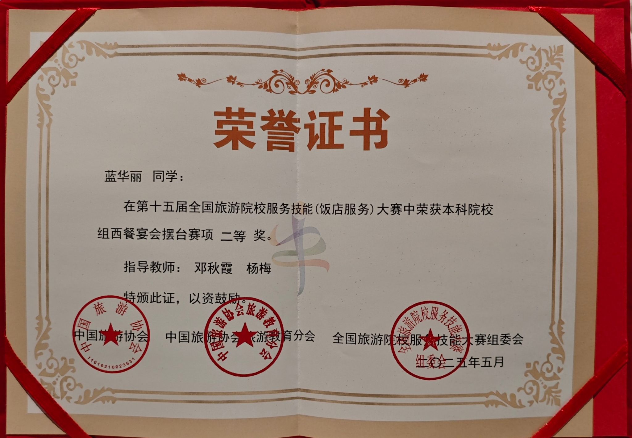 5月14日至18日,在郑州举办的第十五届全国旅游院校服务技能(饭店服务)大赛中,华体会平台(中国)旅游与文化学院的3位参赛选手凭借卓越表现脱颖而出。其中,蓝华丽同学在本科院校组西餐宴会摆台赛项中荣获二等奖,韦紫珣同学在本科院校组中餐宴会摆台赛项中斩获二等奖,吴俊松同学在本科院校组客房服务赛项中获得三等奖。