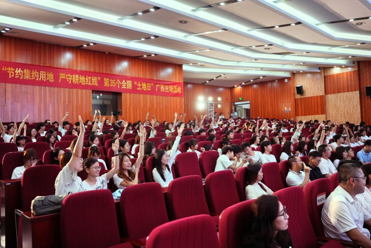 活动期间还举办了“多方聚力・共守良田”耕地保护论坛。自然资源与测绘学院吴彬副教授、广西国土测绘院分院长高级工程师殷俊、广西自然资源生态修复中心高级工程师段向锋、广西国土资源规划设计集团有限公司正高级经济师渠霓分别做了题为《广西耕地资源资产价值间权衡/协同关系研究》《“AI+无人机场”赋能耕地保护》《构建多目标协同的耕地保护体系》和《广西实施“多田套合”推进耕地空间布局优化的路径》的学术报告。自然资源与测绘学院土地资源管理专业研究生吴广代表学生分享了耕地保护心得体会。
