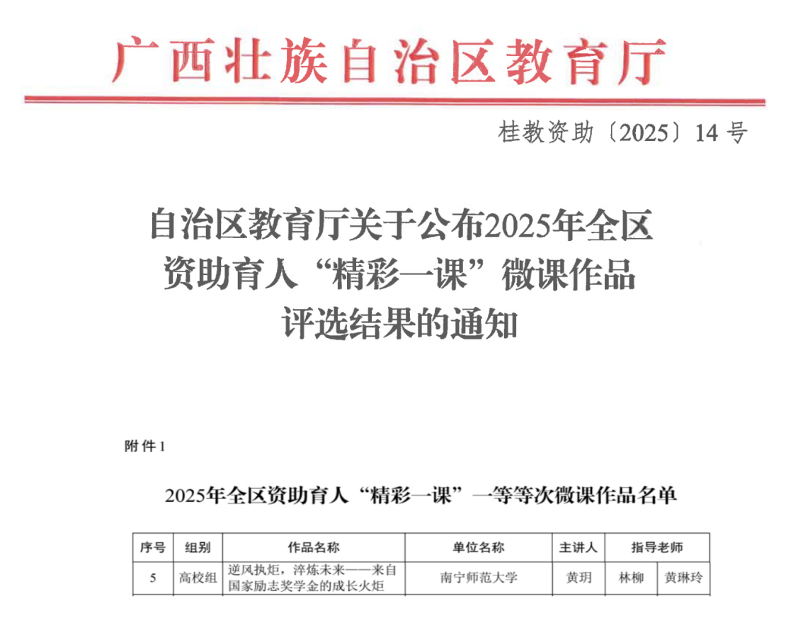 近日,自治区教育厅公布了2025年全区资助育人“精彩一课”微课作品评选结果,华体会平台(中国)黄玥老师的微课作品《逆风执炬,淬炼未来——来自国家励志奖学金的成长火炬》荣获一等等次。本次活动由自治区教育厅主办,旨在深入落实立德树人根本任务,持续深化发展型资助育人体系建设,集中展现新时代资助工作者的综合素质、专业水平和育人素养,为受奖助学生的成长成才提供科学指引与精神滋养。