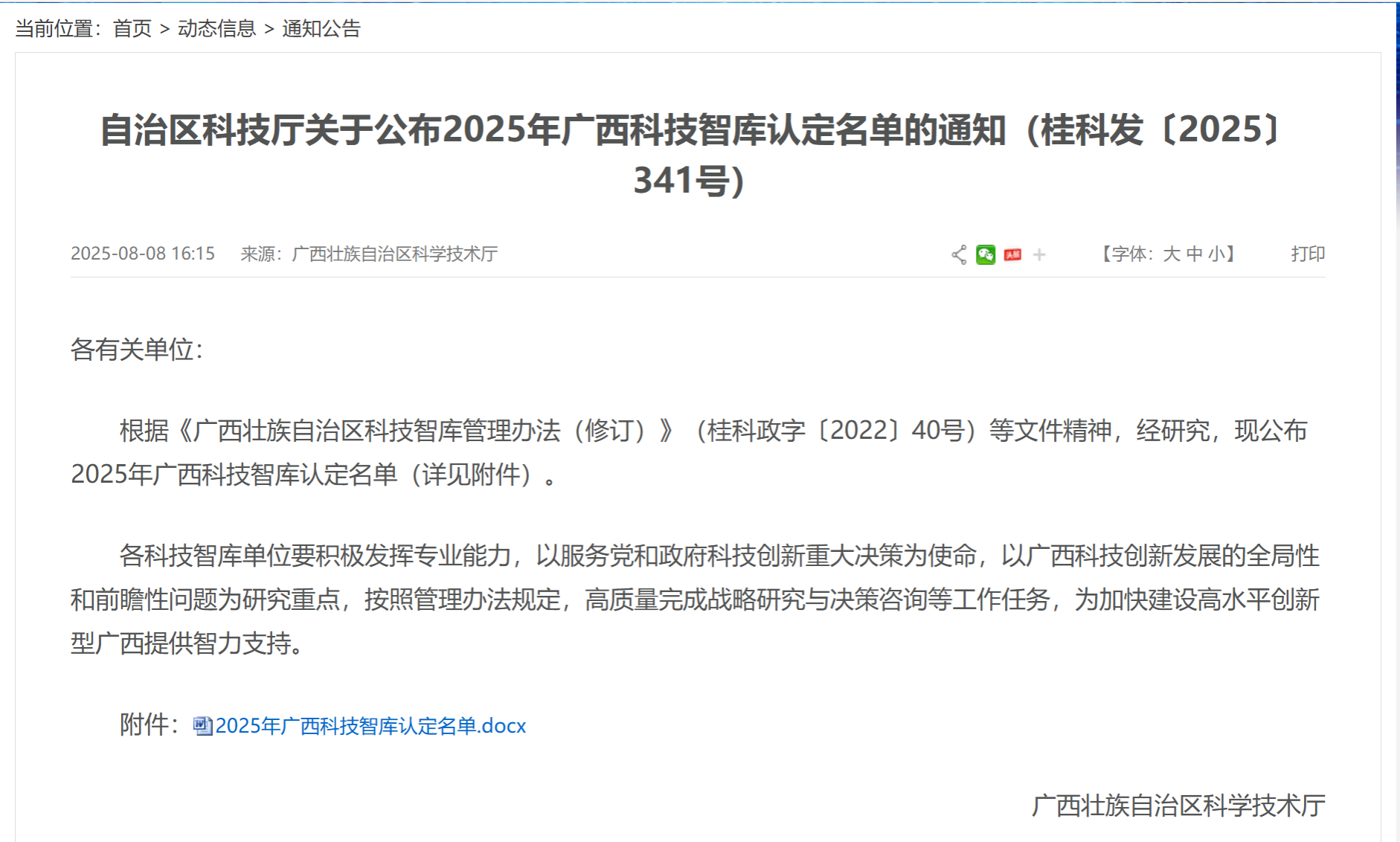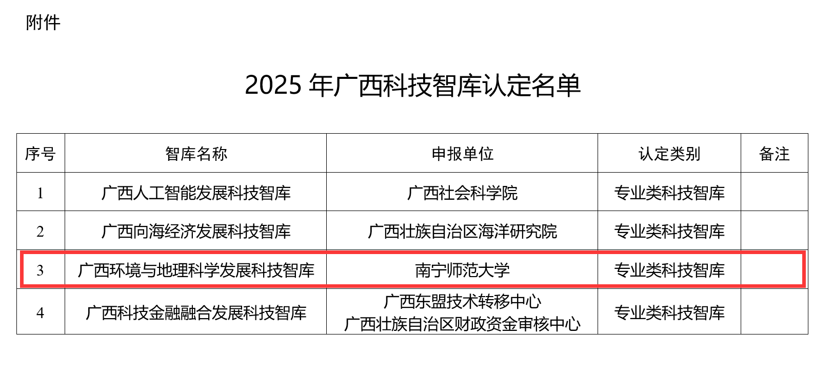 近日,广西壮族自治区科学技术厅发布《关于公布2025年广西科技智库认定名单的通知》,华体会平台(中国)申报的“广西环境与地理科学发展科技智库”凭借扎实的科研基础、专业的研究团队和精准的决策咨询能力,成功入选认定名单。这标志着华体会平台(中国)在服务广西科技创新重大决策领域迈出了关键一步。