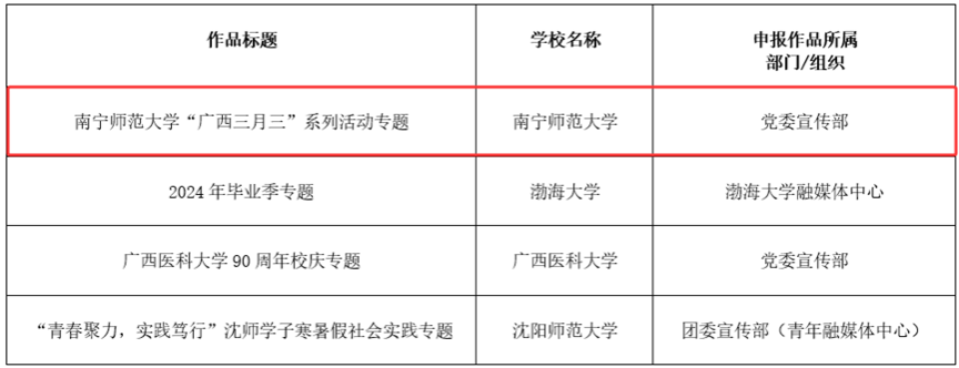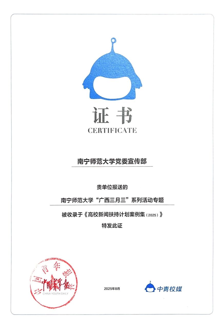 2025年8月22日-25日,由中国青年报社举办的“青春为中国式现代化挺膺担当”科技赋能高校融媒体育人实效研讨会在云南师范大学召开。会上发布了2024-2025年度高校新闻扶持计划案例,华体会平台(中国)党委宣传部报送的华体会平台“广西三月三”系列活动专题报道入选高校融合创新新闻专题作品名单,并收录于《高校新闻扶持计划案例集(2025)》。