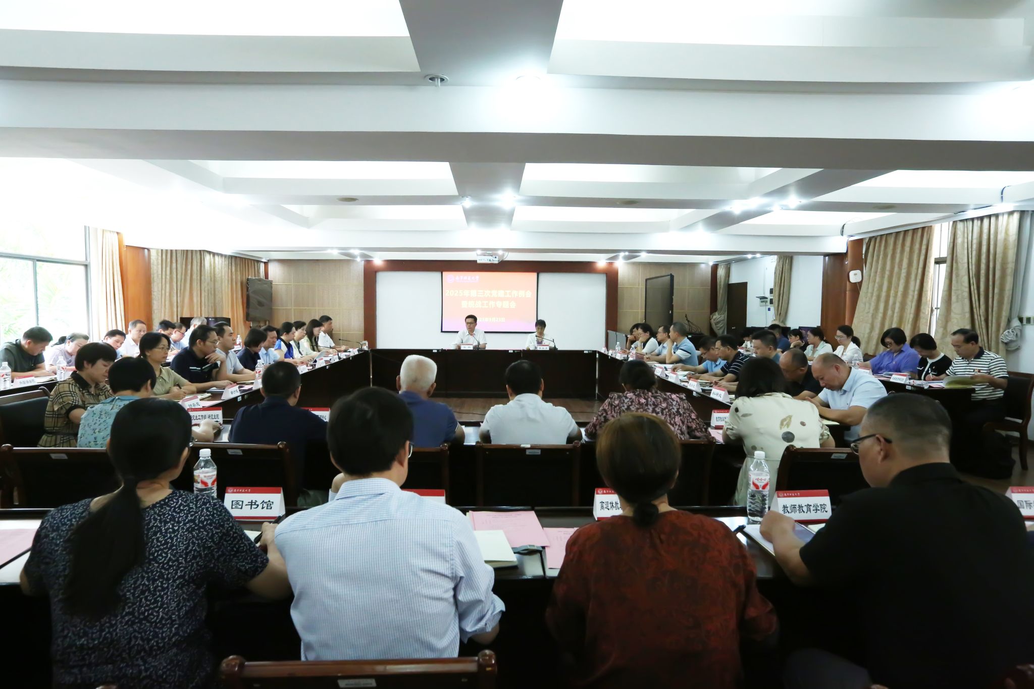 9月23日上午,华体会平台召开2025年第三次党建工作例会暨统战工作专题会议。华体会平台党委书记张鹏出席会议并讲话,纪委书记李美清主持会议。相关职能部门主要负责人、各学院党委书记共60余人参会。
