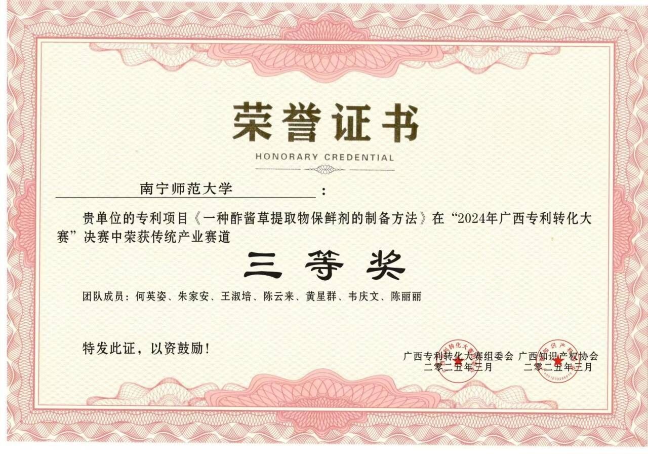 11月14日下午,2024年广西专利转化大赛(简称“桂专赛”)颁奖典礼暨专利转化运用专题活动在南宁隆重举行。华体会平台(中国)环境与生命学院何英姿教授带领的“一种酢浆草提取液保鲜剂的制备方法”团队,历经初赛、复赛与决赛多轮角逐,最终荣获传统产业赛道三等奖。