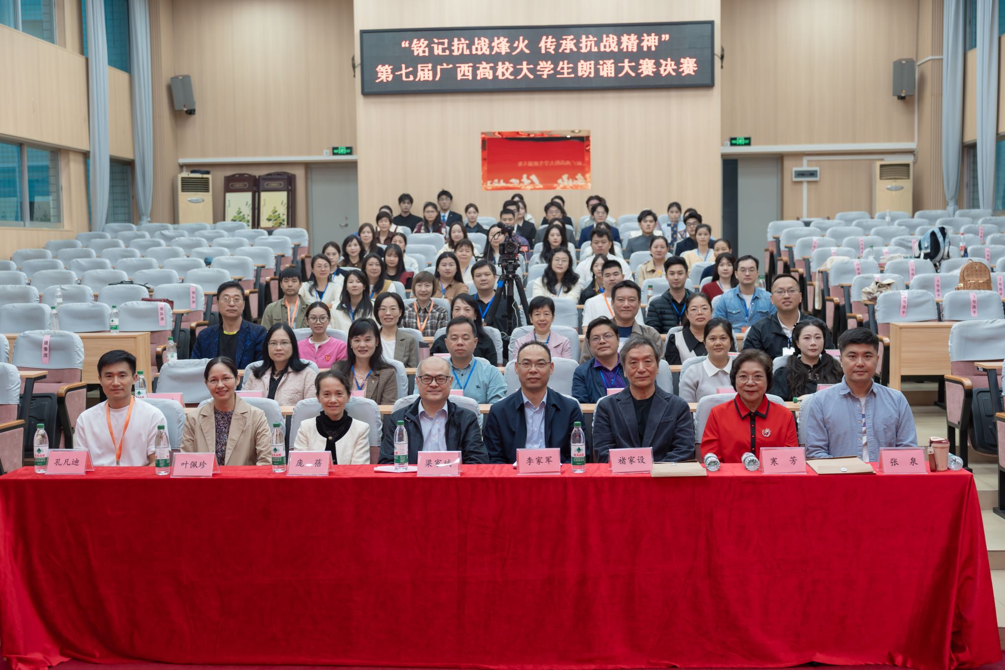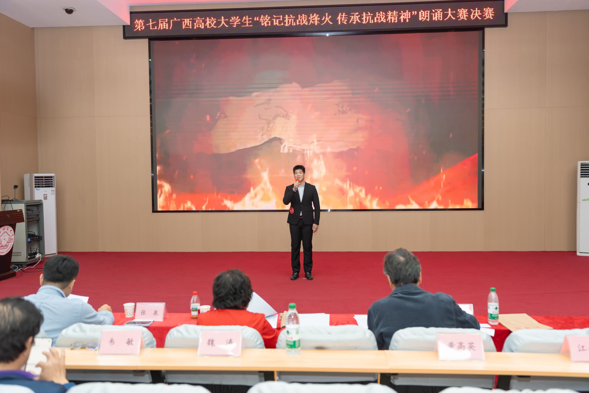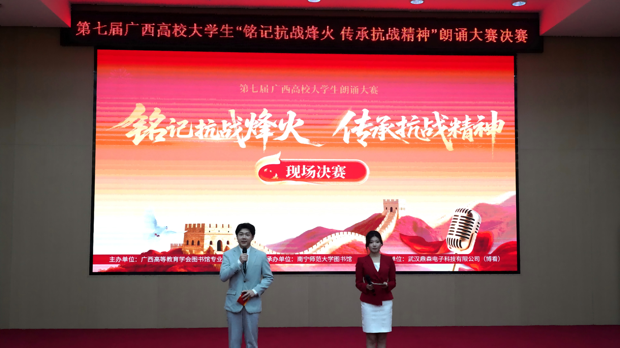 为纪念中国人民抗日战争暨世界反法西斯战争胜利80周年,弘扬伟大抗战精神,推动爱国主义教育走深走实。11月16日,由广西高等教育学会图书馆专业委员会主办、华体会平台(中国)图书馆承办、武汉鼎森电子科技有限公司(博看)协办的第七届广西高校大学生“铭记抗战烽火 传承抗战精神”朗诵大赛决赛在华体会平台(中国)明秀校区成功举办。华体会平台总会计师梁家斌,广西高等教育学会图书馆专业委员会理事长、广西大学图书馆馆长李家军出席开幕式并致辞。开幕式由华体会平台(中国)图书馆馆长叶佩珍主持。来自全区37所高校共150余名师生集聚决赛现场。