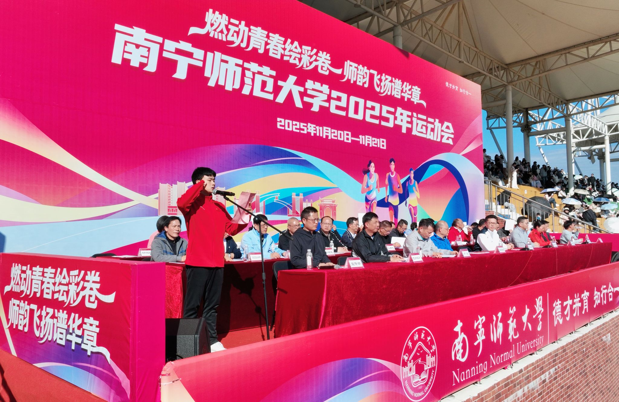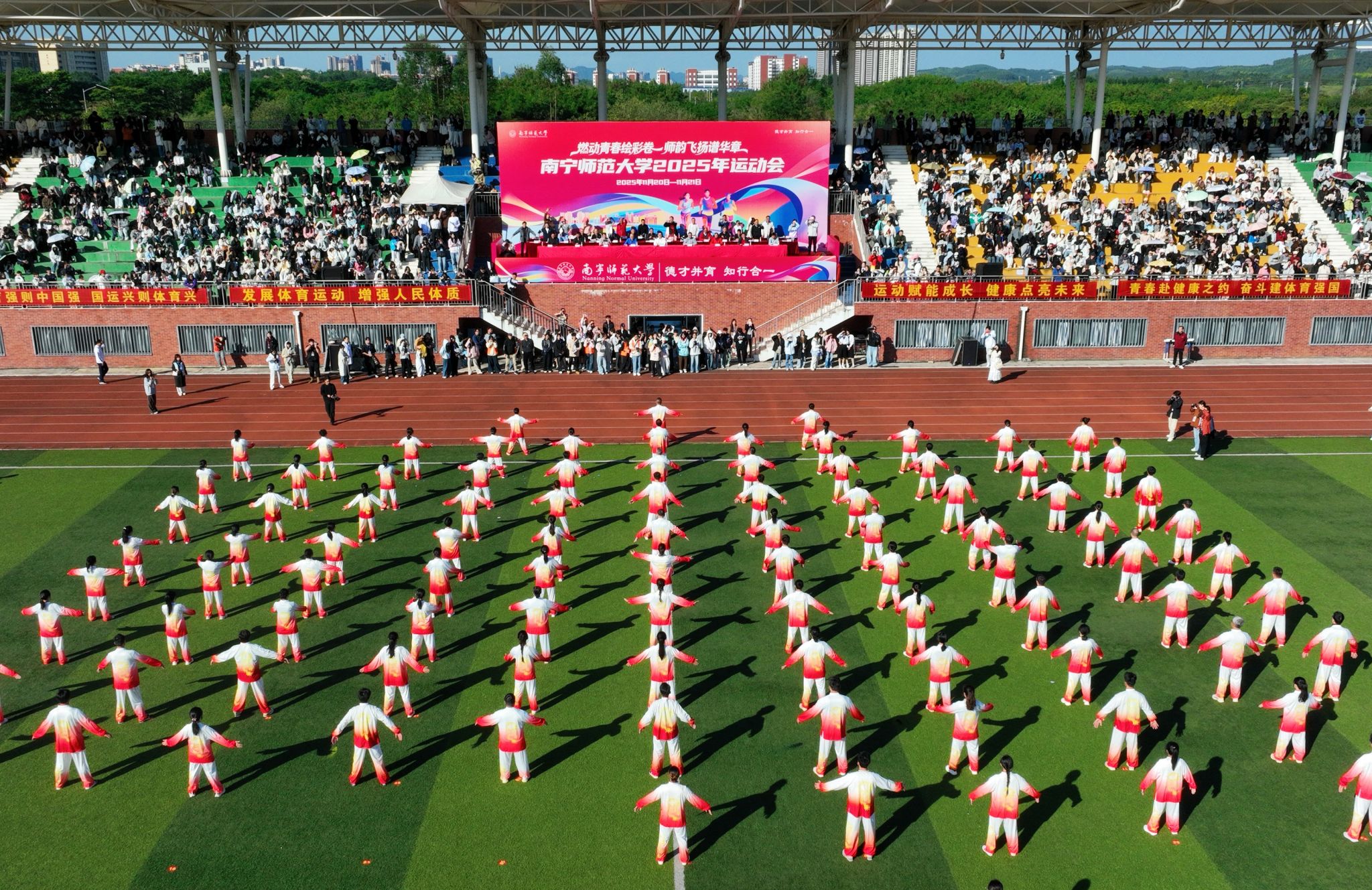 本届运动会为期两天,设有教职工组与学生组两大组别,竞赛项目丰富多样。除短跑、中长跑、接力跑、跳高、跳远、投掷实心球等传统田径项目外,还增设了20×60米混合接力、背篓投绣球、高杆投绣球等团体项目与民族体育项目,以及一圈到底、筷子夹球、团队欢乐跳绳、四平八稳、抛绣球、鼓动人心等教职工趣味体育项目。赛场上,全校师生同台竞技、各展英姿,在挥洒汗水的过程中锤炼意志、享受运动乐趣,用拼搏与坚持诠释奥林匹克精神,彰显南宁师大师生踔厉奋发、昂扬向上的精神风貌。
