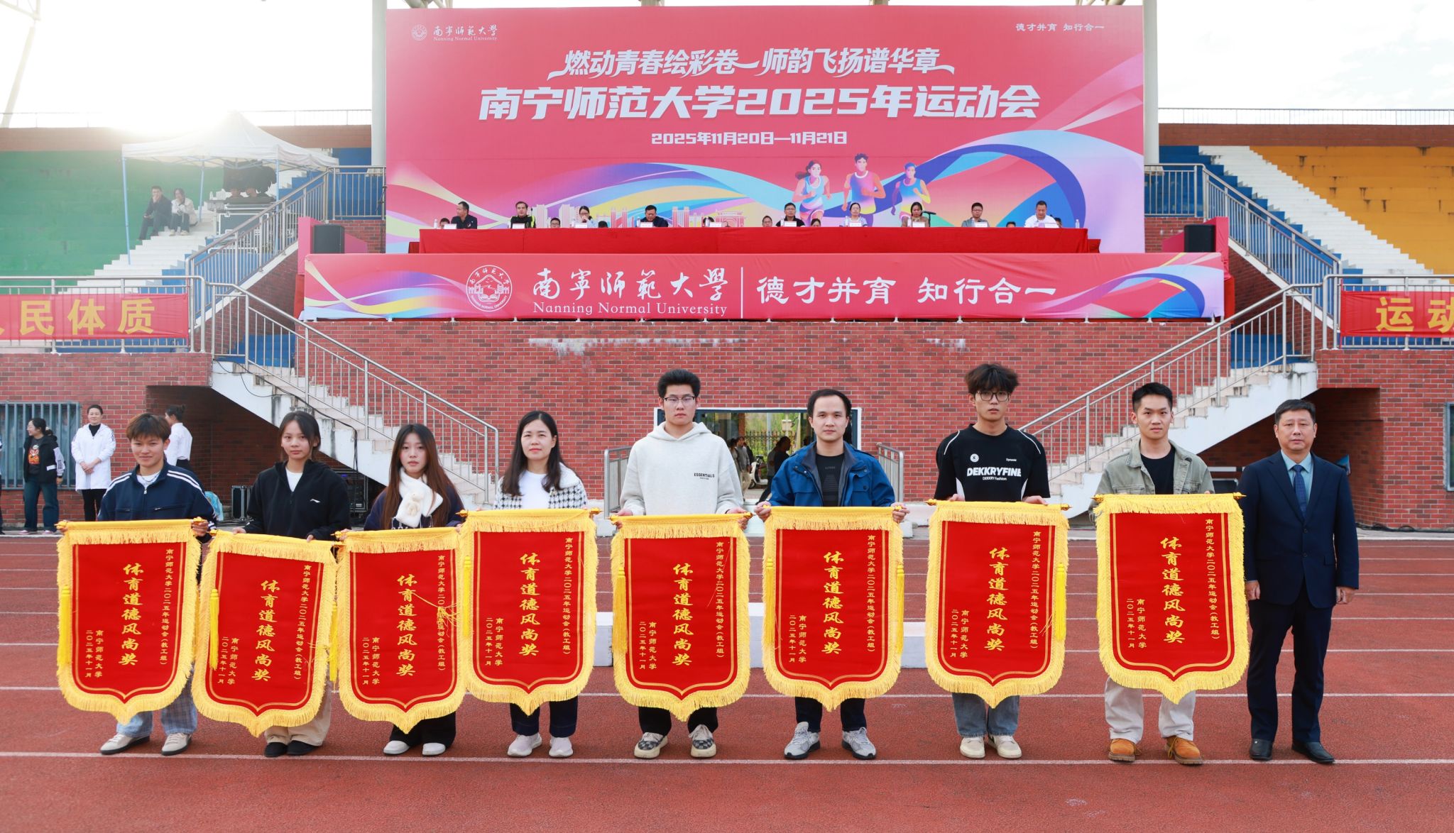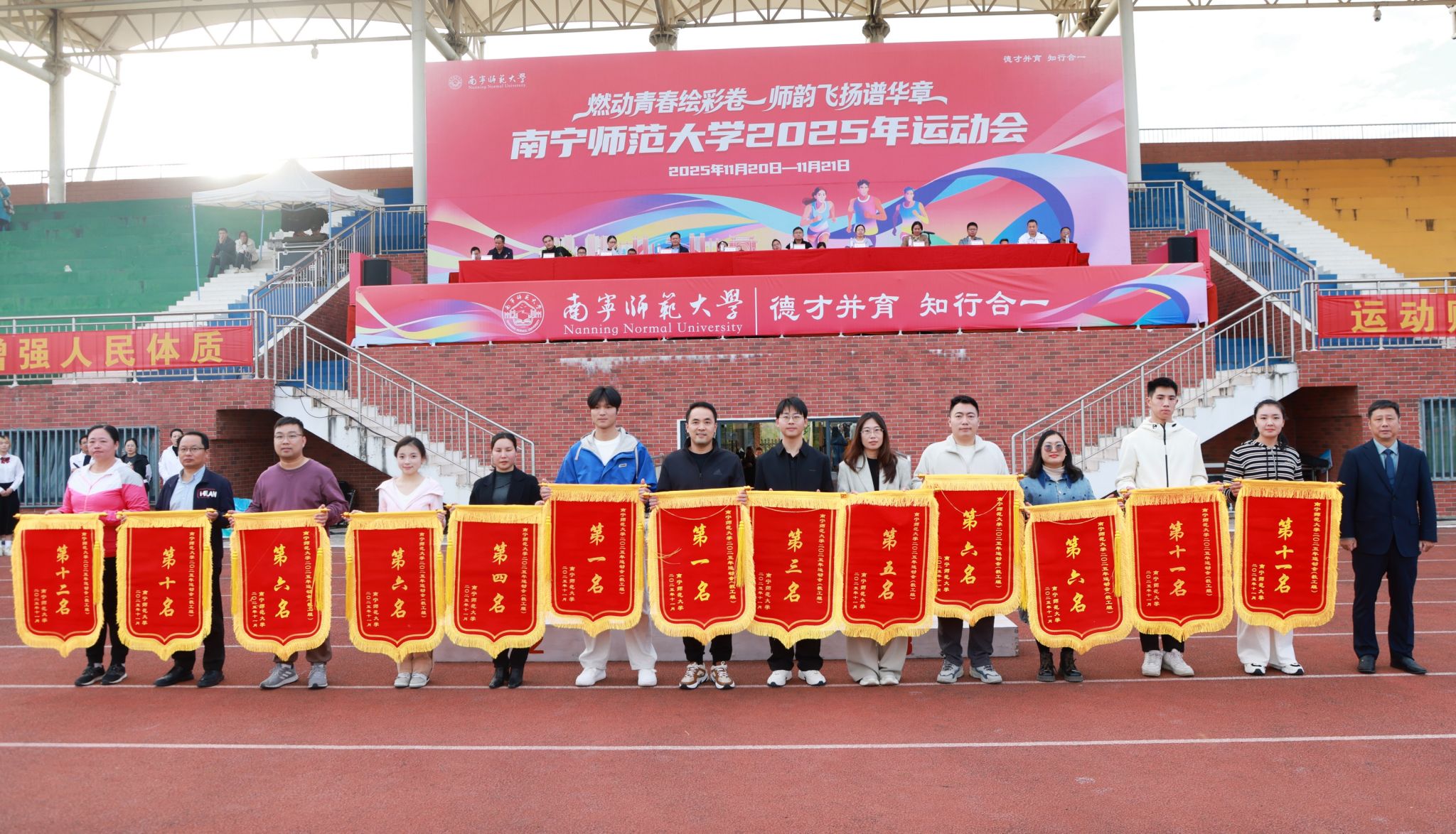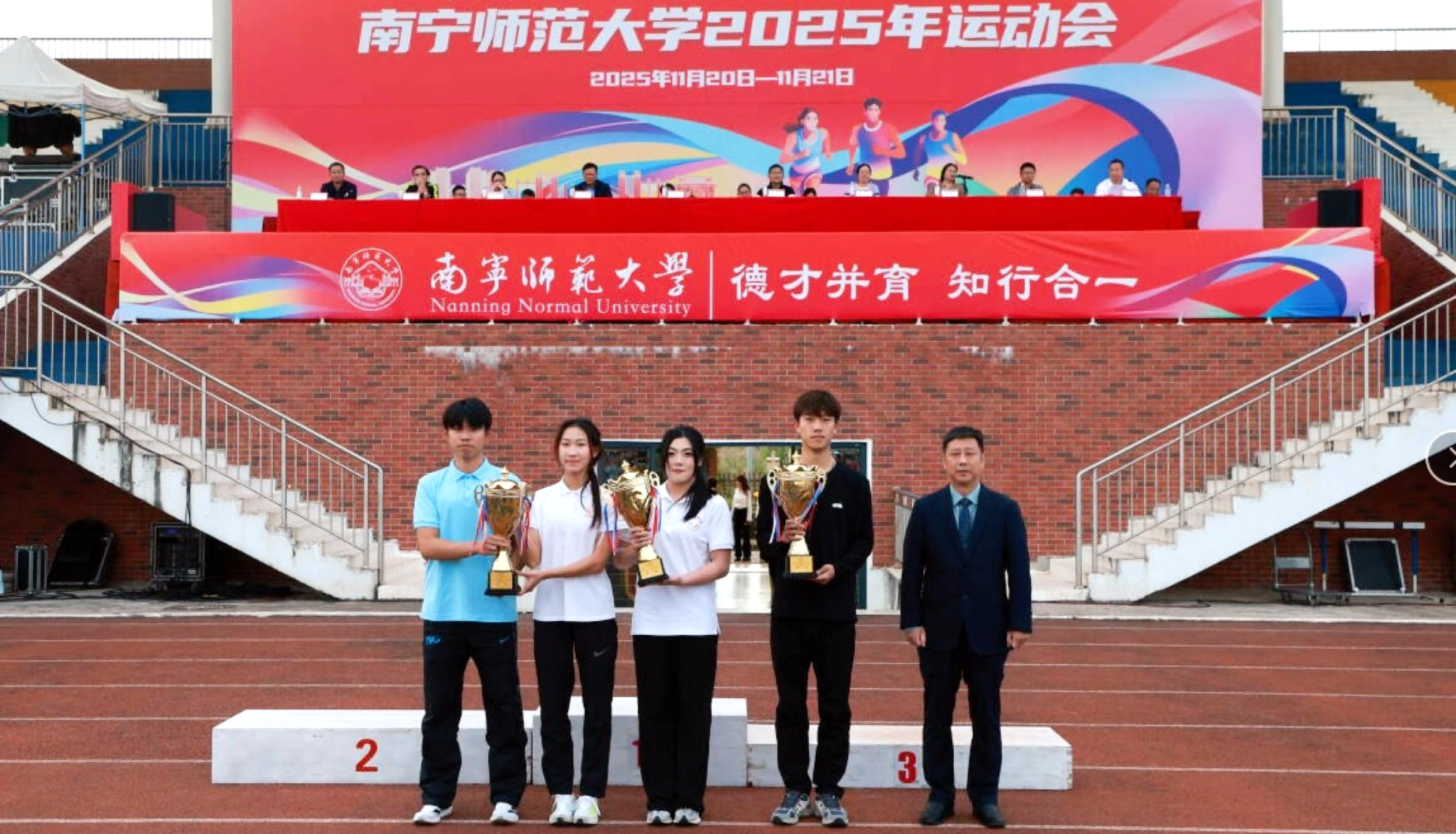 教职工趣味运动会中,学生工作部(处)、团委、工会、国内合作处、师园学院联合分工会与附属实验华体会平台分工会并列第一名,地理科学与规划学院分工会获第三名,16个分工会获“体育道德风尚奖”。学生组甲组比赛中,数学与统计学院、研究生学院、地理科学与规划学院获甲组男女生团体总分前三名,数学与统计学院、研究生学院、环境与生命科学学院获甲组男子团体总分前三名,数学与统计学院、研究生学院、马克思主义学院获甲组女子团体总分前三名。学生组乙组比赛中,体育与健康学院2025级包揽乙组男女团体和乙组男子总分第一名,2024级获乙组女子总分第一名。此外,23个学生组参赛单位获“体育道德风尚奖”,体育与健康学院荣获“特殊贡献奖”。
