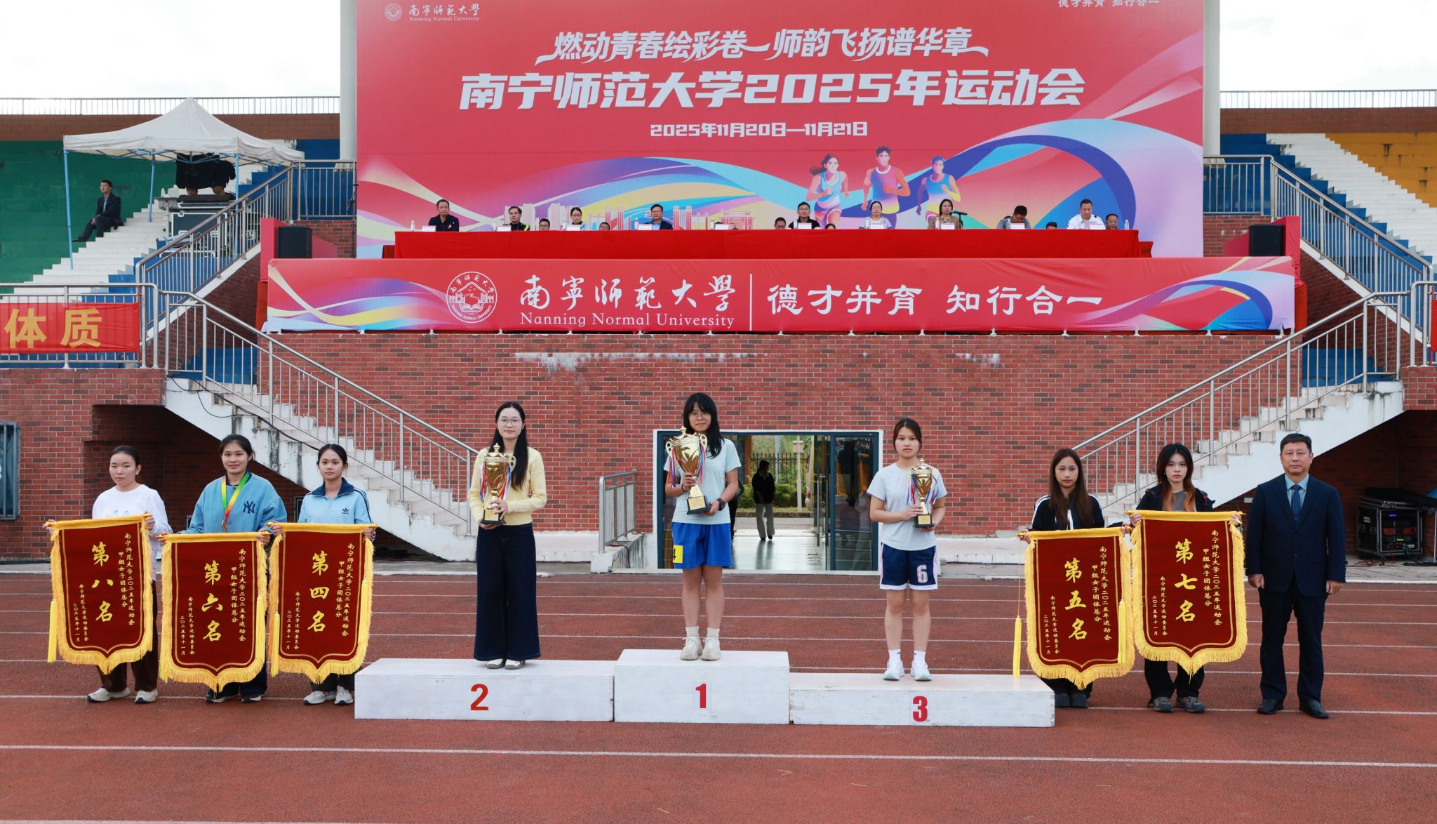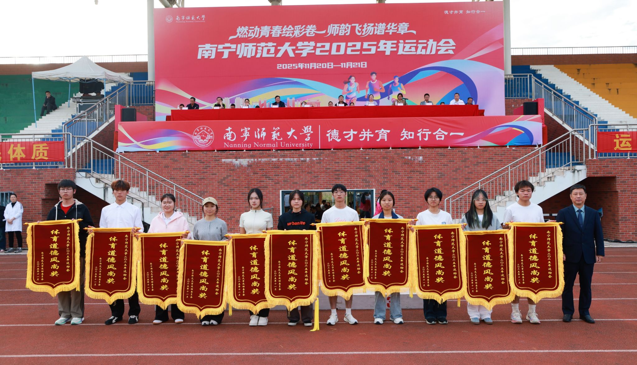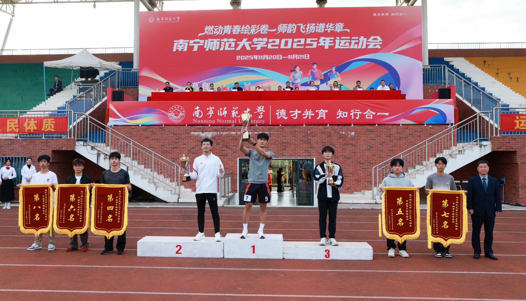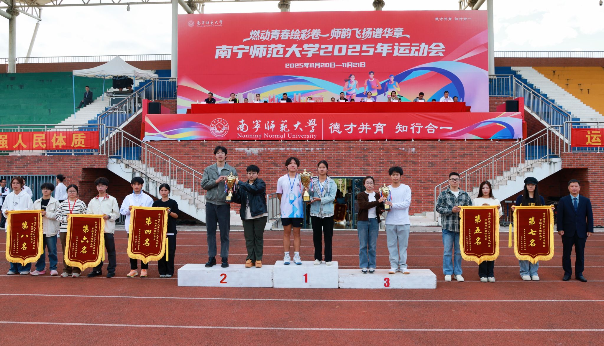 教职工趣味运动会中,学生工作部(处)、团委、工会、国内合作处、师园学院联合分工会与附属实验华体会平台分工会并列第一名,地理科学与规划学院分工会获第三名,16个分工会获“体育道德风尚奖”。学生组甲组比赛中,数学与统计学院、研究生学院、地理科学与规划学院获甲组男女生团体总分前三名,数学与统计学院、研究生学院、环境与生命科学学院获甲组男子团体总分前三名,数学与统计学院、研究生学院、马克思主义学院获甲组女子团体总分前三名。学生组乙组比赛中,体育与健康学院2025级包揽乙组男女团体和乙组男子总分第一名,2024级获乙组女子总分第一名。此外,23个学生组参赛单位获“体育道德风尚奖”,体育与健康学院荣获“特殊贡献奖”。