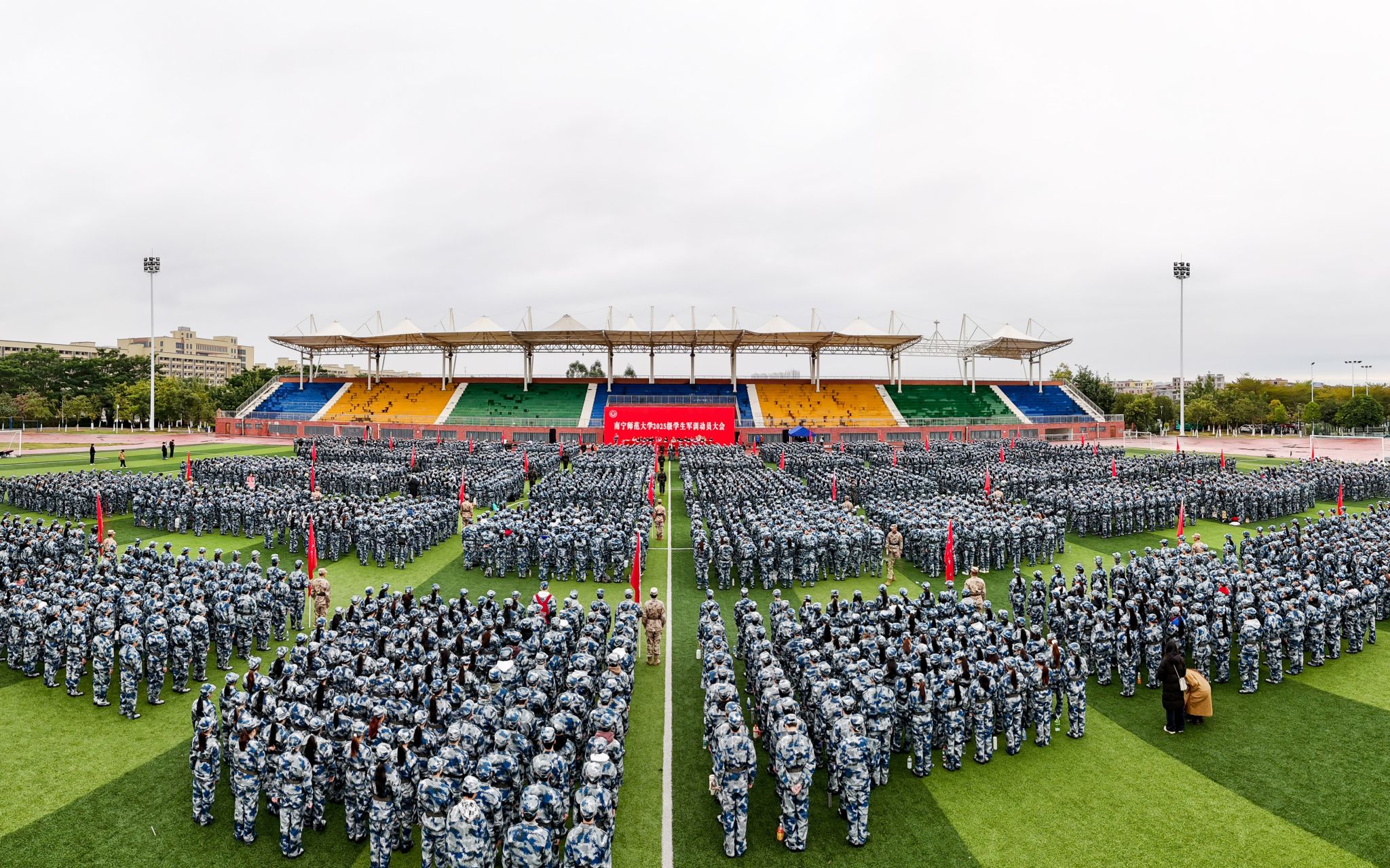大会宣布了2025级学生军事训练实施计划。在激昂的乐曲中,动员大会圆满结束,参训学子随即以饱满的热情投入军训。