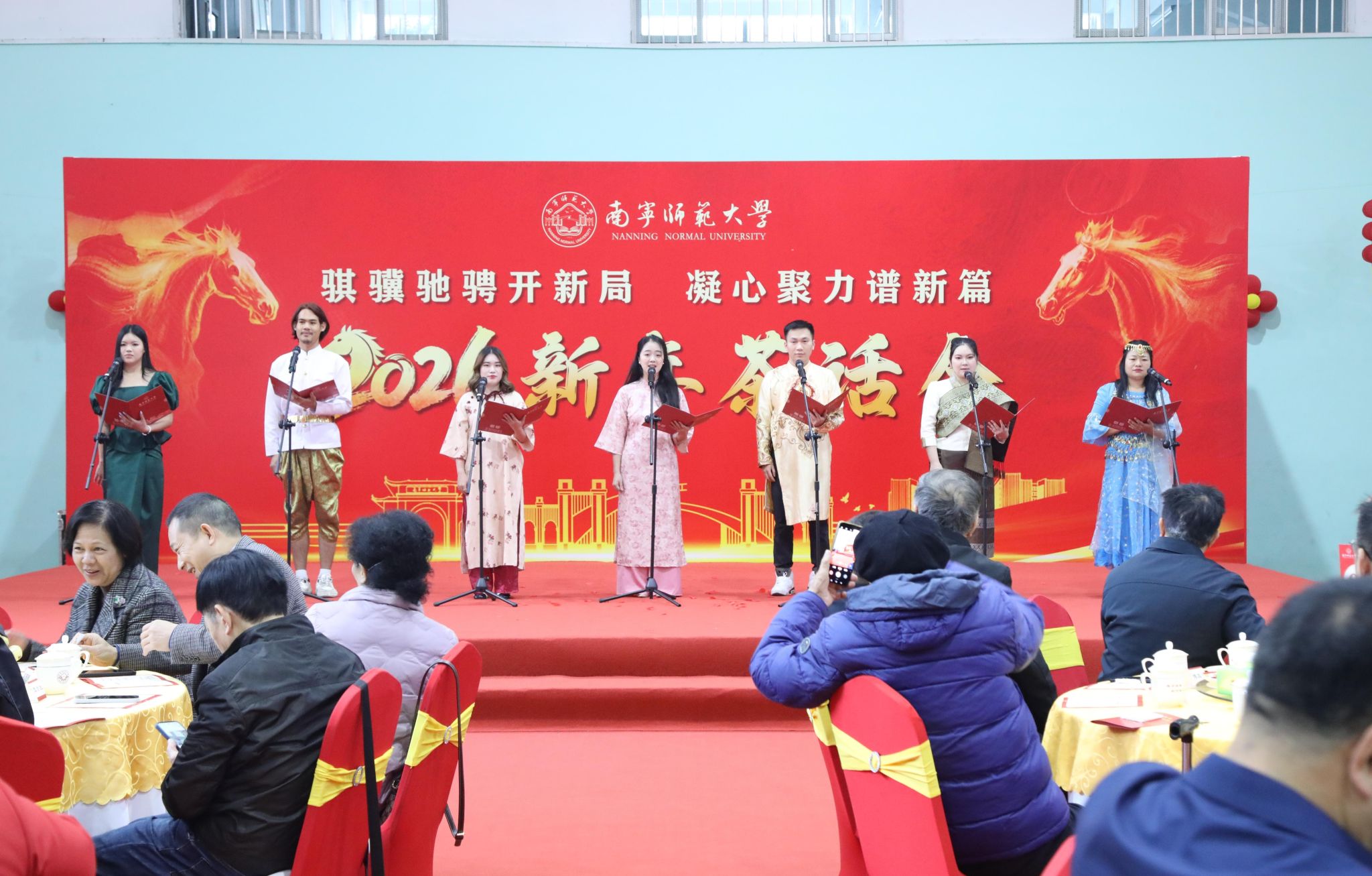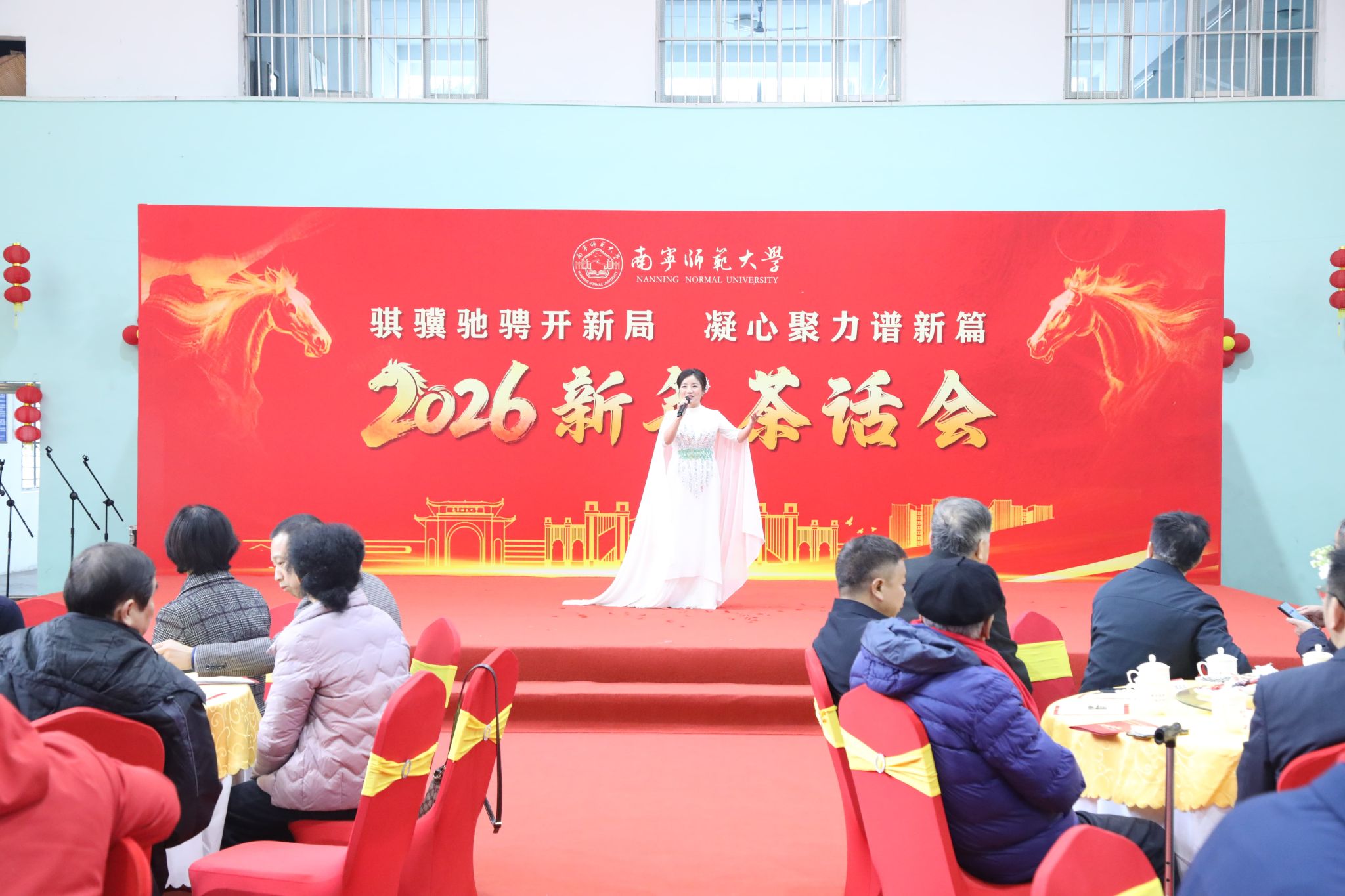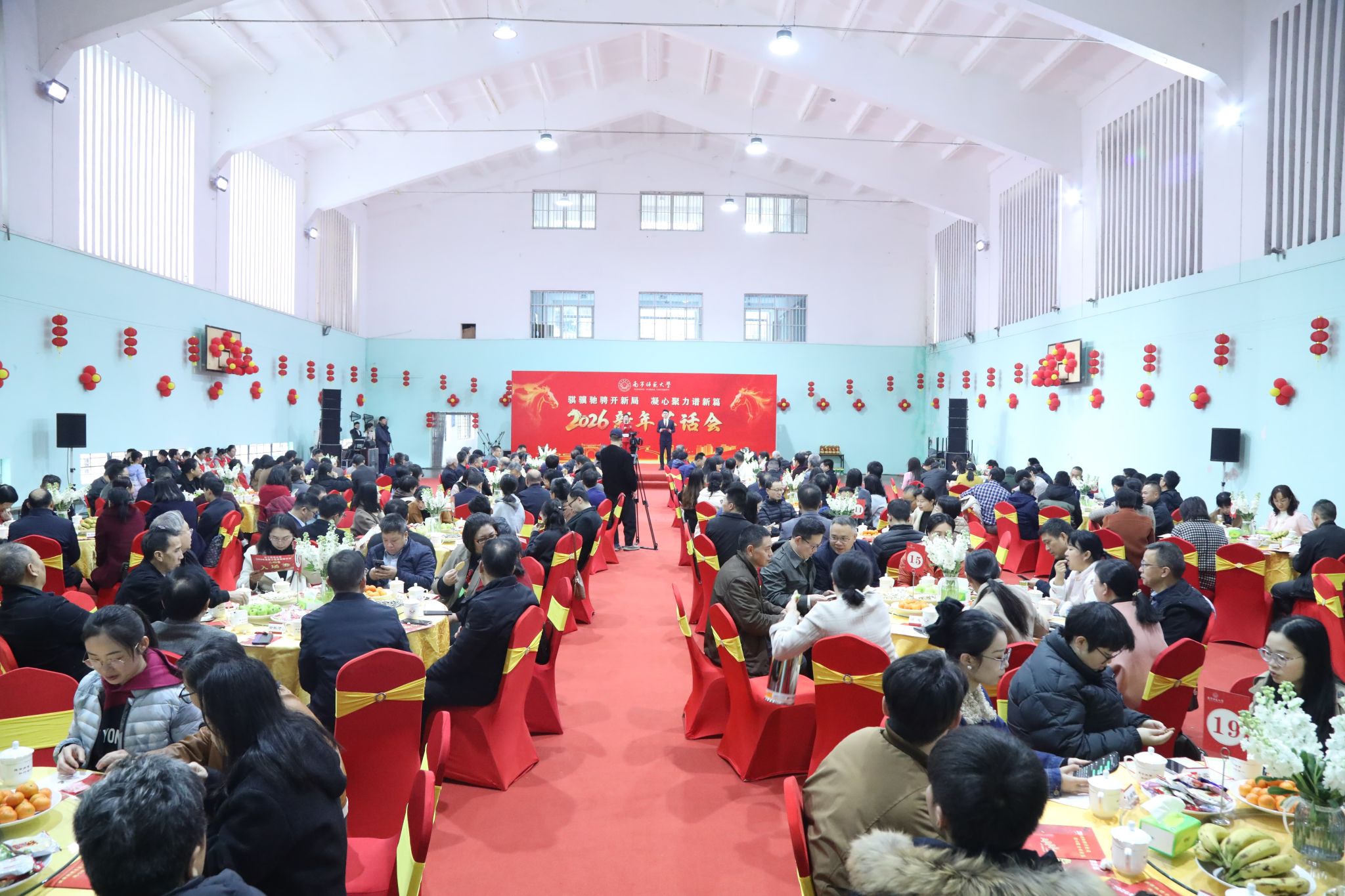 为凝聚师生情谊、共话发展蓝图,1月10日上午,华体会平台(中国)在明秀校区体育馆举行2026新年茶话会。全体在家校领导、退休校领导、老党员代表、高层次人才、中层干部代表、统一战线代表、师德模范代表、教学、科研工作突出代表、优秀学生代表、贫困生代表、留学生代表及一线工作人员等200余人欢聚一堂,共迎新春、共绘未来,现场暖意融融、喜气洋洋。
