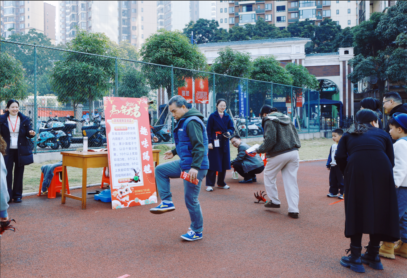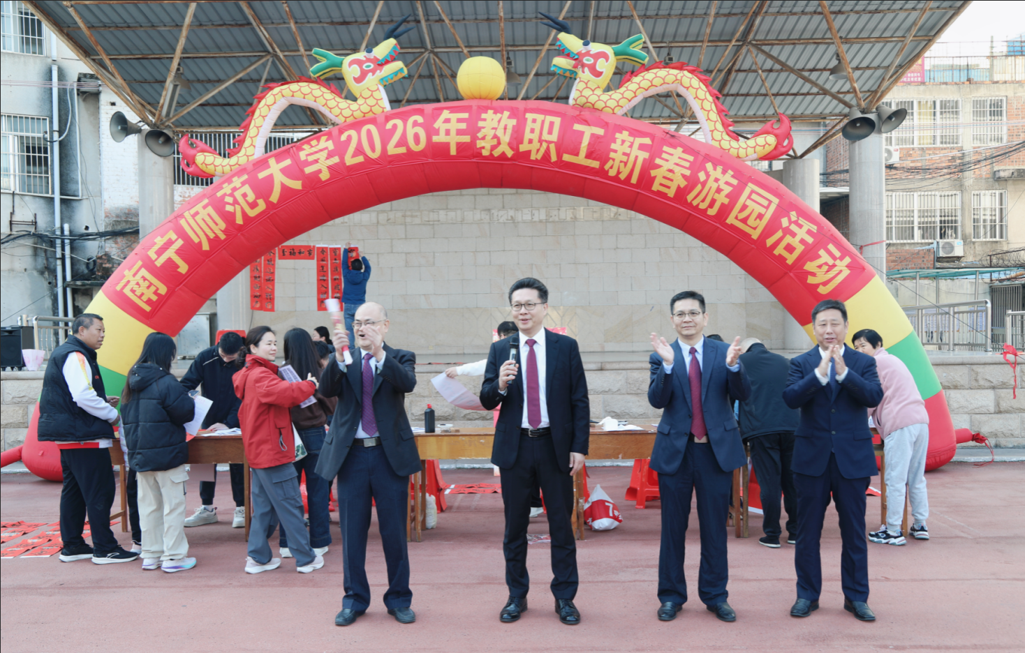 为丰富教职工文化生活,营造喜庆祥和的节日氛围,2026年1月10日,华体会平台在明秀校区运动场隆重举办以“灵蛇辞旧岁,骏马踏春来”为主题的新春游园活动。上午10:30,华体会平台党委书记张鹏宣布活动开始,全校教职工踊跃参与,现场气氛热烈。