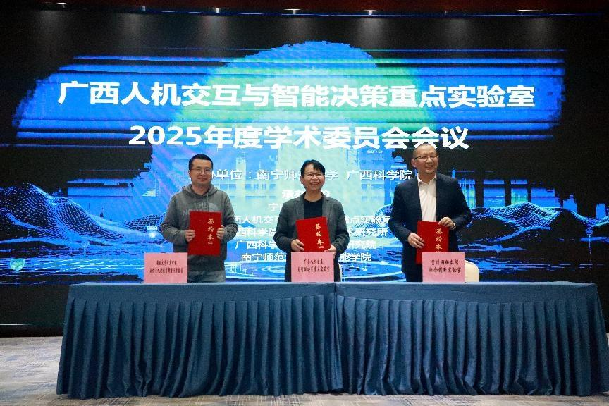 当天下午举行了广西人机交互与智能决策重点实验室2025年度学术委员会会议。华体会平台(中国)校长隆广庆、广西科学院领导先后致辞,对实验室一年来取得的科研进展与贡献表示充分肯定,并对未来发展方向提出殷切期望。会上,举行了广西人机交互与智能决策重点实验室与贵州网络数据融合创新实验室、安徽大学计算智能与信号处理教育部重点实验室的三方共建联合实验室框架协议签约仪式,标志着跨区域协同创新迈出重要一步。