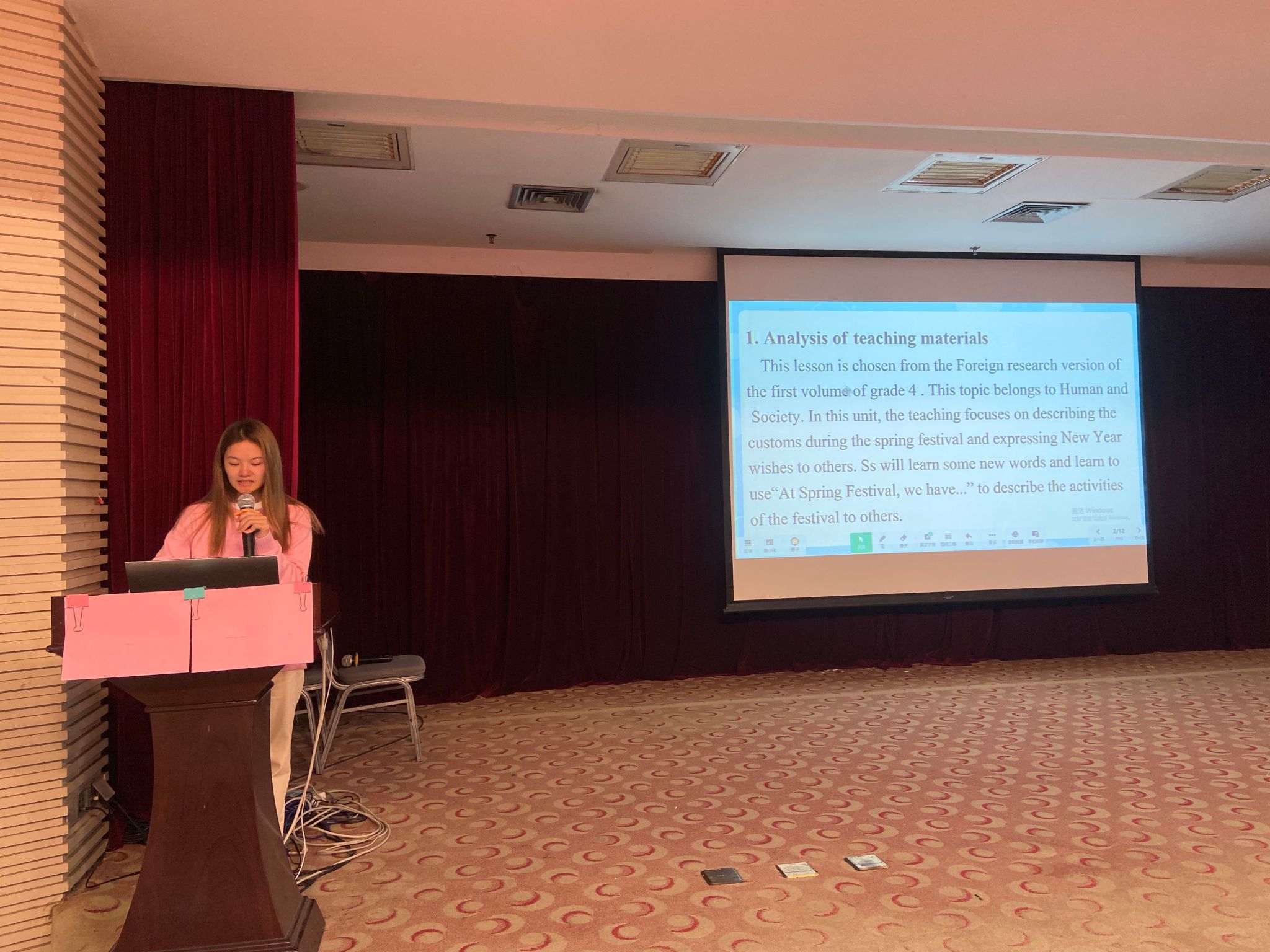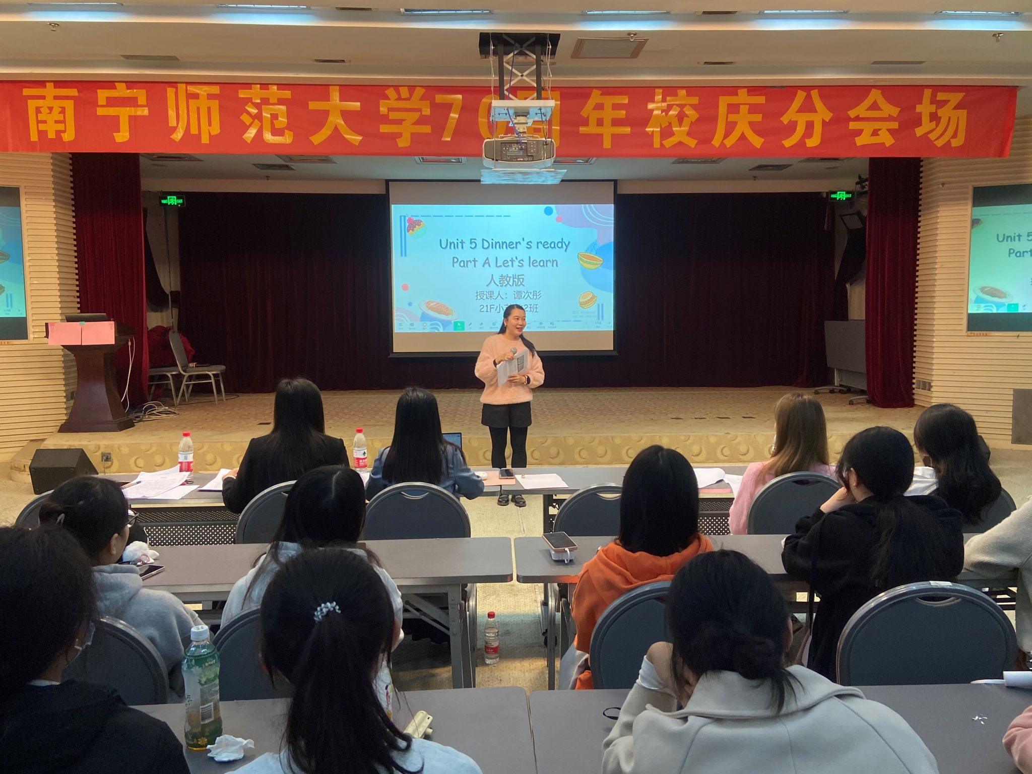 说课比赛中,一班黄小婷同学展示的是外研版四年级上册Module 10 Unit 1 We have a big family dinner.二班盘艳美同学展示的是人教版五年级上册Unit 5 There is a big bed.三班杨艳玲同学展示的是外研版六年级上册Module 7 Unit 1 I don’t believe it!微课比赛中,一班韦秀丽同学展示的是四年级上册Module 10 Unit 1 We have a big family dinner.二班谭次彤同学展示的是人教版四年级上册Unit 5 Dinner is ready. Part A Let’s learn.三班林欣仪同学展示的是中国文化英语绘本阅读课程The Introduction to the Spring Festival.虽然准备时间略显仓促,但不论是说课还是微课,同学们都展示出了扎实的英语语言功底和较好的英语教学能力,是本学期实习成果的一次实践检验。