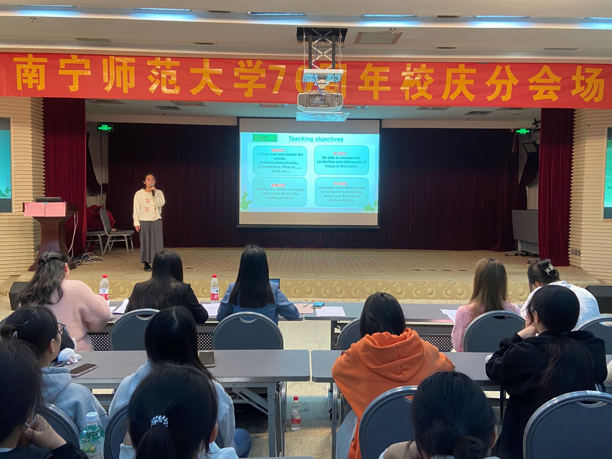 比赛结束后,评委老师们首先肯定了选手们勇于面对挑战的精神和比赛过程中展示出来的良好心态与专业素养,接着从仪容仪表、教资教态、语音语调、教学活动的组织以及课堂调控技巧、说课、微课的流程及要求等方面对每一位选手的表现进行了专业评价并给出改进建议。比赛结束后,南宁市华衡小学科研主任及宣传室主任韦静老师为同学们做了“用英语讲好中国故事——在寓教于乐中传承非遗文化”专题讲座,她结合自己十五年教学实践,分享了英语教育戏剧在小学的运用实践经验,以及在英语学科融合实践中传承优秀民族文化的案例,受到与会学生的一致好评。