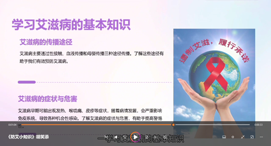 本次比赛面向学院全体学生,得到了同学们的热烈响应,积极投递参赛作品。这些作品均围绕艾滋病的预防、关爱艾滋病患者等主题展开。同学们充分发挥想象力,运用丰富多样的拍摄手法和剪辑技巧,将严肃的艾滋病防治话题通过生动有趣、富有感染力的视频呈现出来。有的作品以纪实风格讲述了艾滋病患者的真实生活经历,呼吁社会给予他们更多理解与支持;有的则采用动画形式,深入浅出地解释了艾滋病的传播途径和预防措施,便于观众理解和接受。