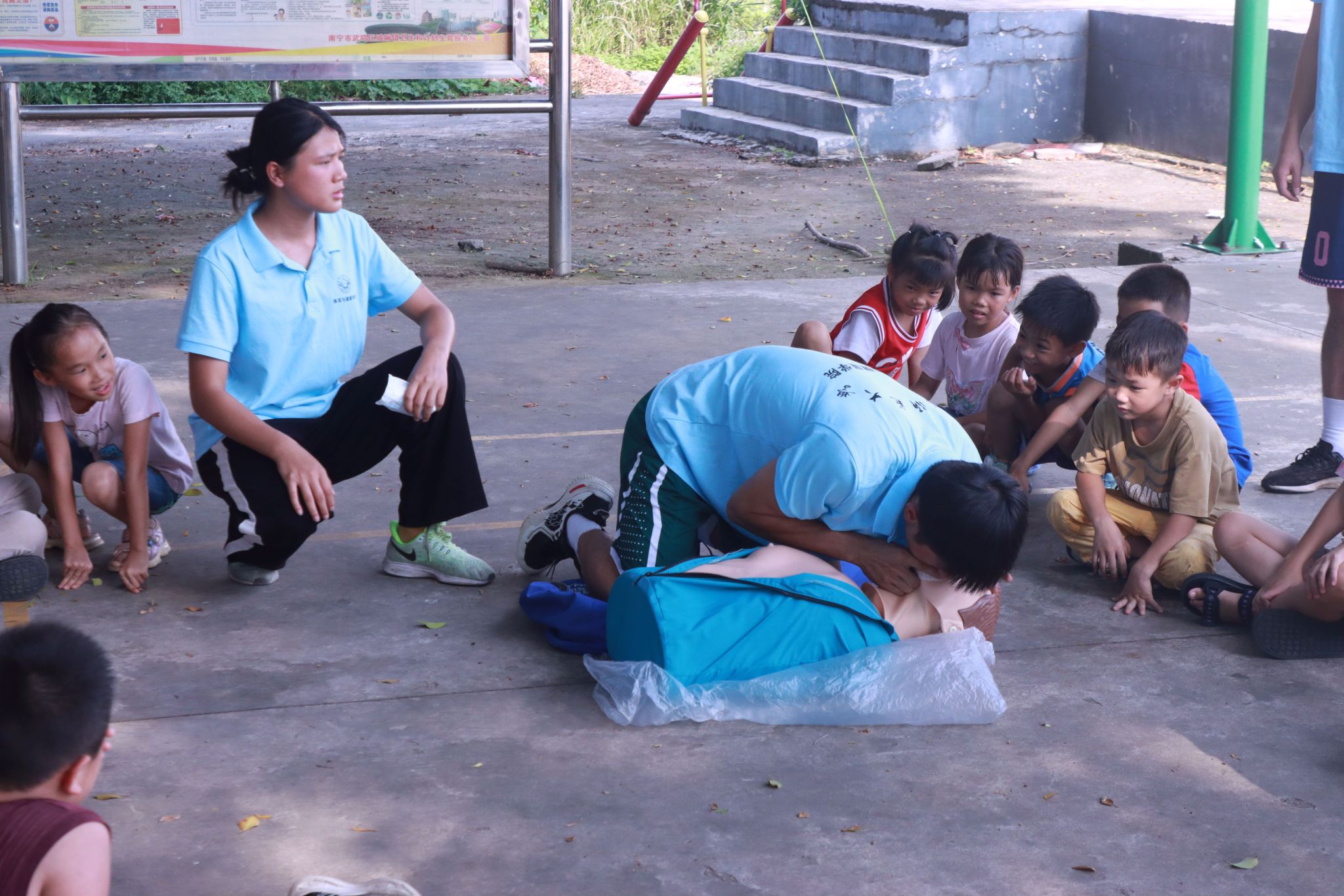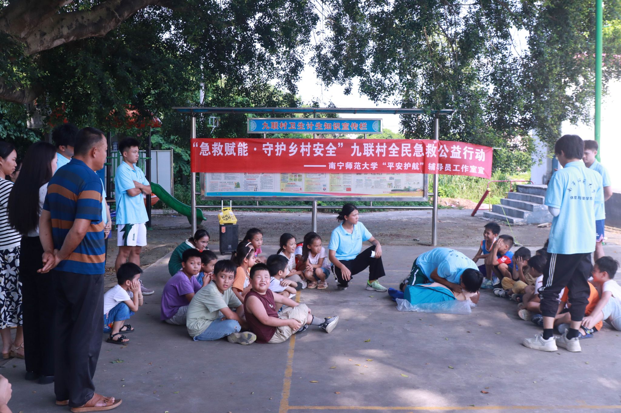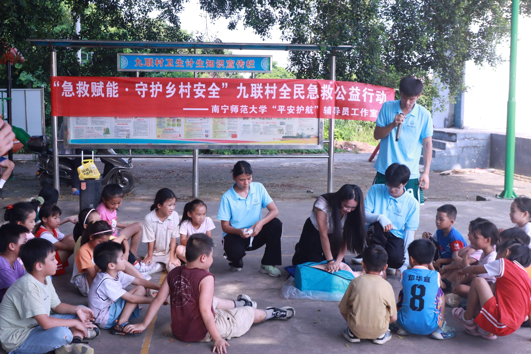 为普及防汛防溺急救知识,增强乡村小学生防灾避险能力,筑牢校园安全防线,7月17日,华体会平台“平安护航”辅导员工作室联合体育与健康学院“体健赋能·壮韵九联”暑期实践团在南宁市武鸣区九联村组织开展“急救赋能·守护乡村安全”九联村全民急救公益行动。急救培训由实践团队员讲解演示,九联村村委会干部、九联村部分家长及小学生参加。