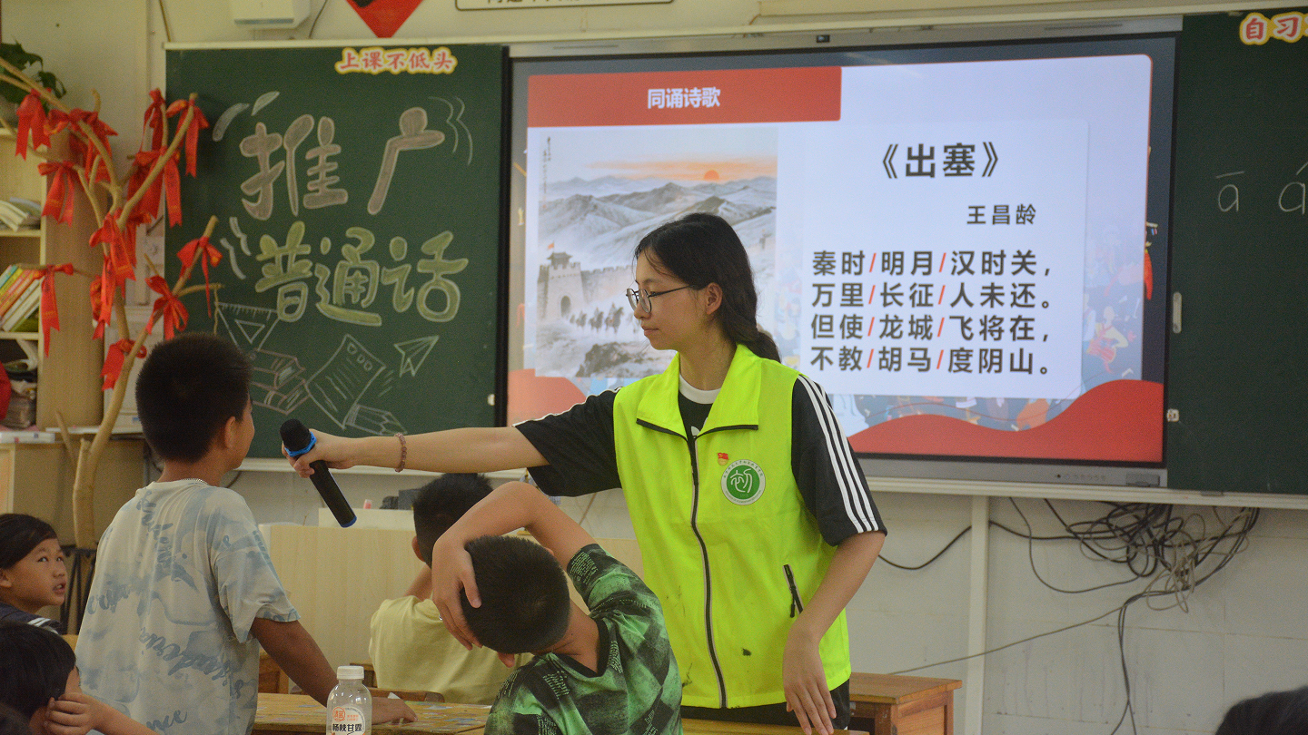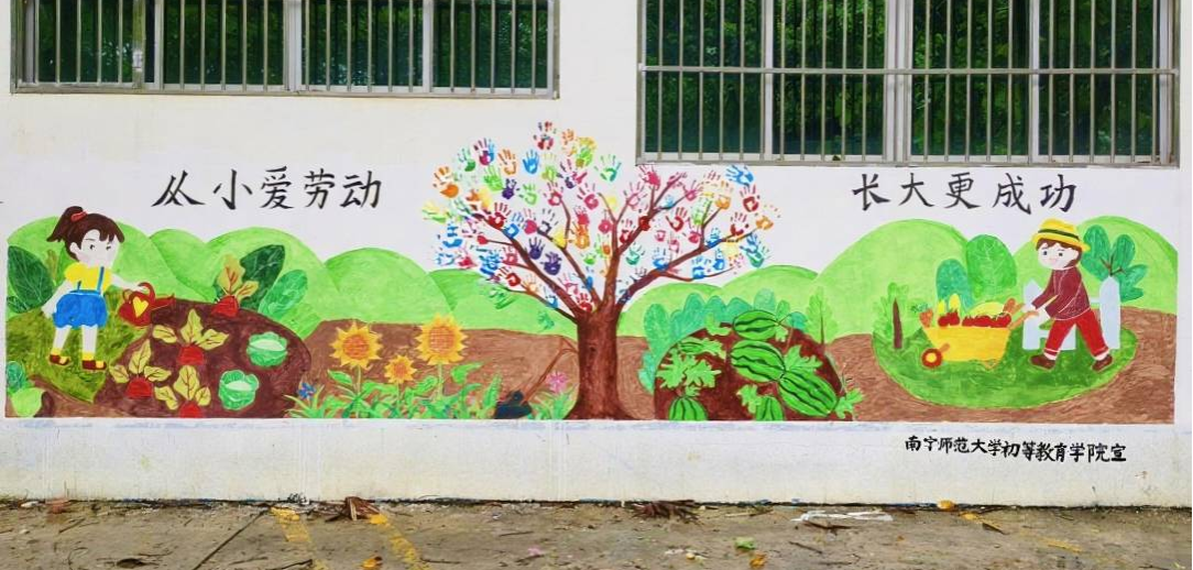 实践团充分发挥师范专业优势,精心打造“七彩夏日·快乐成长”系列活动。在普通话推广活动中,采用“普通话+壮语”双语教学,通过诗歌朗诵、壮语童谣传唱等形式,既提升了孩子们的普通话水平,又增强了民族文化认同。在“小手绘未来”墙绘活动中,志愿者与孩子们共同创作,用五彩画笔描绘劳动之美,将劳动教育理念融入艺术实践。还用“AI智绘”让孩子们在科技体验中画出白头叶猴、金花茶等广西特色动植物,感受家乡生物多样性之美。