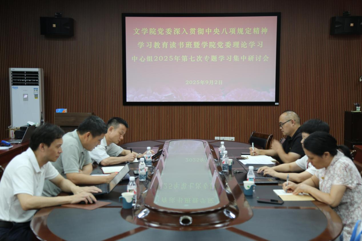 9月2日下午,文学院党委于理综404举办了“深入贯彻中央八项规定精神学习教育读书班”暨2025年第七次理论学习中心组专题研讨会。学院党委理论学习中心组成员参加本次会议。