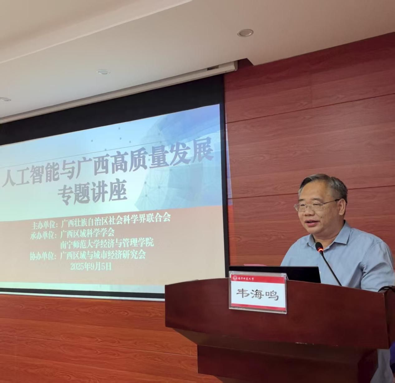 为深入学习贯彻习近平总书记关于人工智能的重要论述,贯彻落实自治区党委关于发展人工智能赋能千行百业的决策部署,聚焦人工智能与广西经济社会各领域融合发展的关键问题,探索高质量发展新路径、新动能。9月5日,由广西壮族自治区社会科学界联合会主办,广西区域科学学会与华体会平台经济与管理学院承办,广西区域与城市经济研究会协办的“人工智能与广西高质量发展”专题讲座在华体会平台五合校区顺利举行。本次讲座由经济与管理学院党委书记韦海鸣教授主持,来自校内外专家、学者约60人参会。