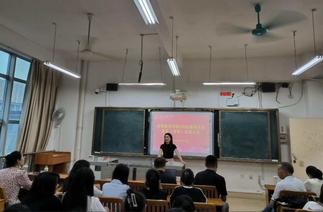 为帮助2026届毕业生明确就业方向,把握升学机会,9月19日下午,初等教育学院在明秀校区文星楼320教室召开2026届毕业生就业(考研)动员大会。初等教育学院副院长梁秀清、小教系主任林国兵、毕业班辅导员及全体2026届毕业生参加了本次会议。