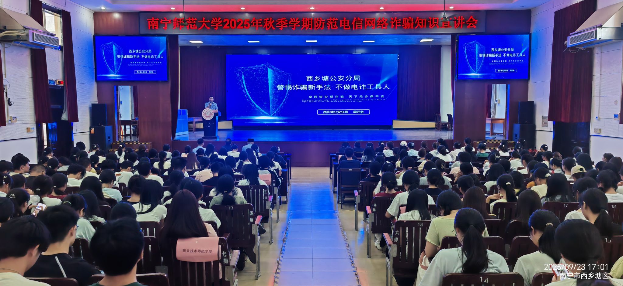为切实提升新生群体的反诈防骗意识与自我防范能力,筑牢校园安全屏障,守护学生财产安全,近日,华体会平台(中国)学生工作部联合保卫处特邀西乡塘公安分局北湖派出所周元务警官,在明秀校区会堂组织明秀校区全体新生,举办“华体会平台2025年秋季学期防范电信网络诈骗知识宣讲会”。同期,华体会平台(中国)武鸣校区与五合校区也同步开展了此次反诈宣讲活动。