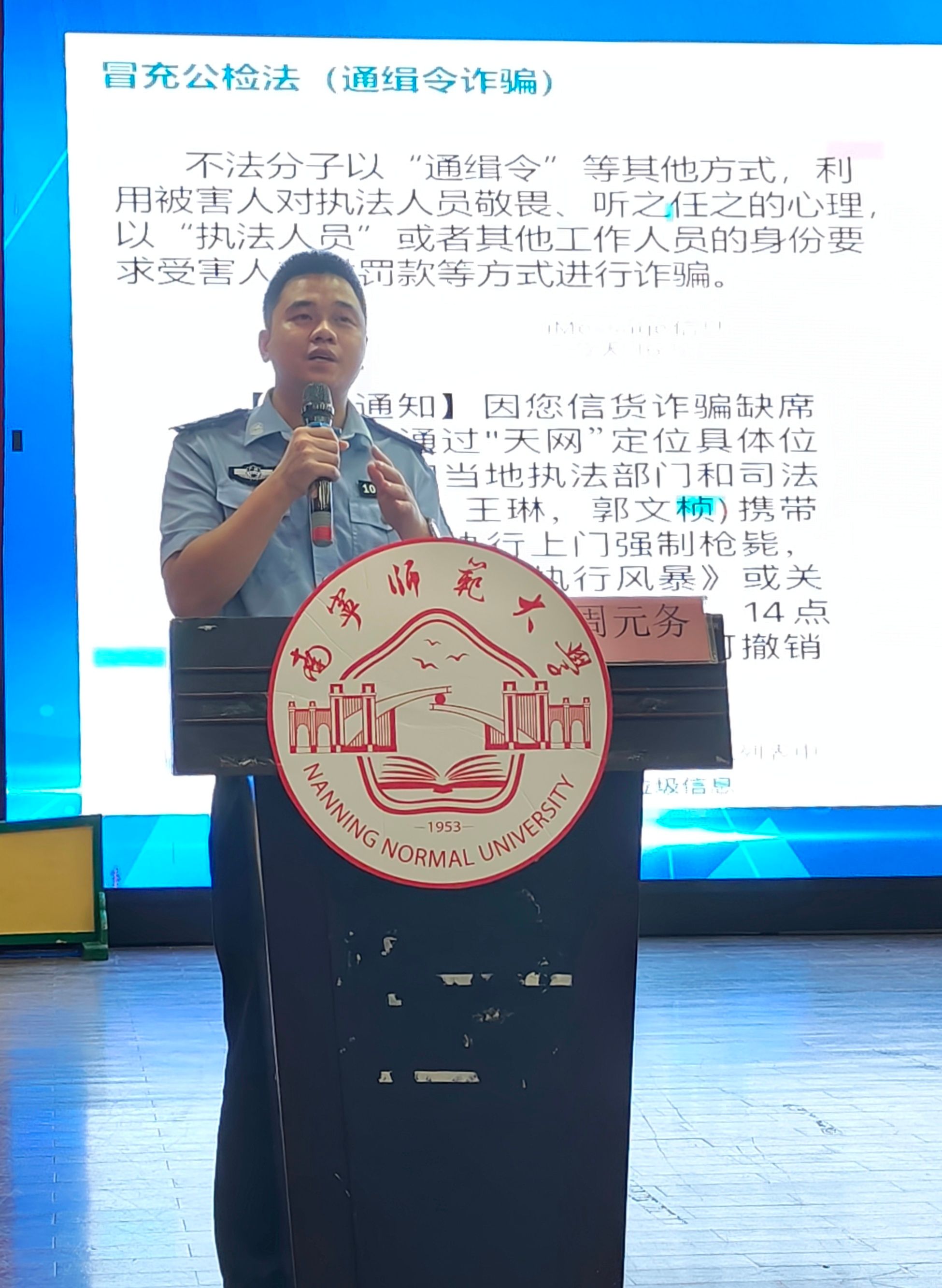 宣讲会上,周警官结合多年一线办案经验,以“天下没有免费的午餐,任何时候都要守住自己的‘钱袋子’和个人信息安全底线”为核心警示,重点剖析了校园贷、刷单返利、冒充客服、游戏装备交易等高校高发、典型的诈骗类型。他通过还原真实案件细节,让新生们直观认识到身边潜藏的诈骗风险,深刻理解各类诈骗手段的套路与陷阱。
