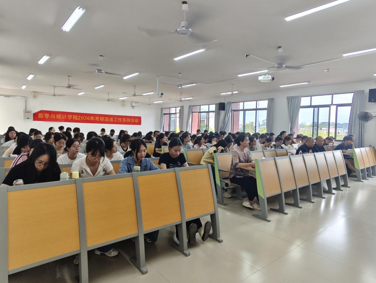 为帮助毕业生认清就业形势,开启吹响就业工作的号角,同时助力考研学生厘清备考方向,破解择校、科目选择、复习规划等核心困惑,9月24日,数学与统计学院在武鸣校区开展2026届毕业生就业动员大会暨考研指导讲座。本次会议分专业、分层次开展,2022级全体毕业生参加,学院院长黄在堂、副书记王卫彬、副院长韦扬江、副院长刘利斌、毕业班班主任、学院负责就业辅导员参与本次会议。