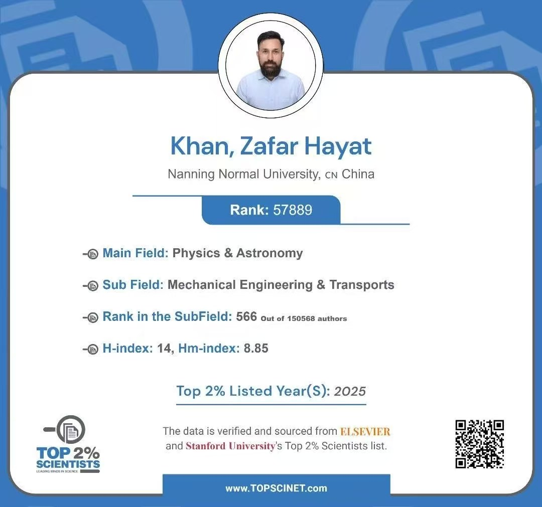 近日,美国斯坦福大学发布了2025年度《全球前2%顶尖科学家榜单》(第八版)。华体会平台(中国)数学与统计学院的可汗(Khan, Zafar Hayat)教授再度荣耀登榜,同时入选全球“前2%顶尖科学家”榜单与“终身科学影响力排行榜”。