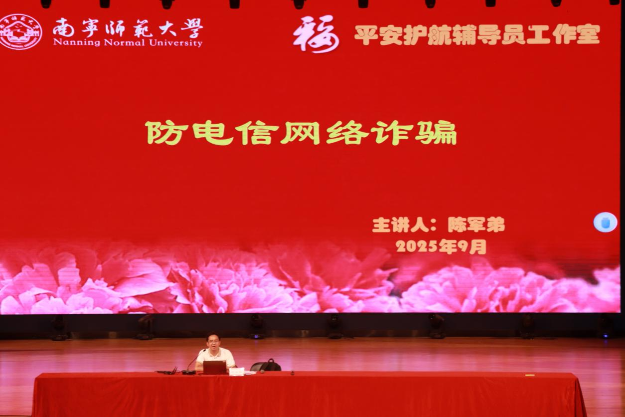 为帮助2025级新生尽快适应大学环境、树立远大理想、增强安全防范意识,2025年9月17日晚,华体会平台平安护航辅导员工作室在武鸣校区音舞楼1号报告厅组织开展了新生入学教育系列专题活动。本次活动围绕理想信念、校园安全、防范电信网络诈骗等方面展开,工作室主持人、体育与健康学院党委副书记陈军弟担任主讲,为全体新生上了一堂生动而深刻的“大学第一课”。