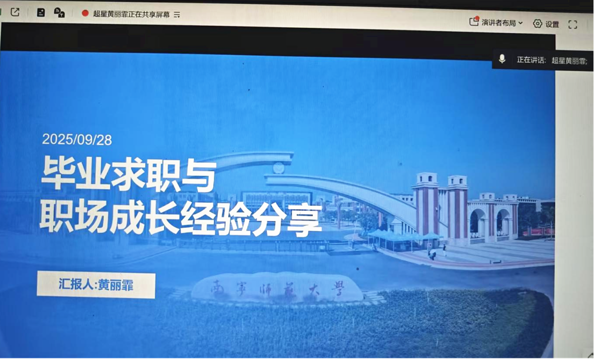 现任超星泛雅集团大客户销售黄丽霏优秀校友结合自身从“南师学子”到“职场人”的成长历程,分别从“求职准备”“职场起步与深耕”两大维度分享就业经验,鼓励学弟学妹打破地域限制、树立“积极就业、理性择业”“先就业再择业”的观念。