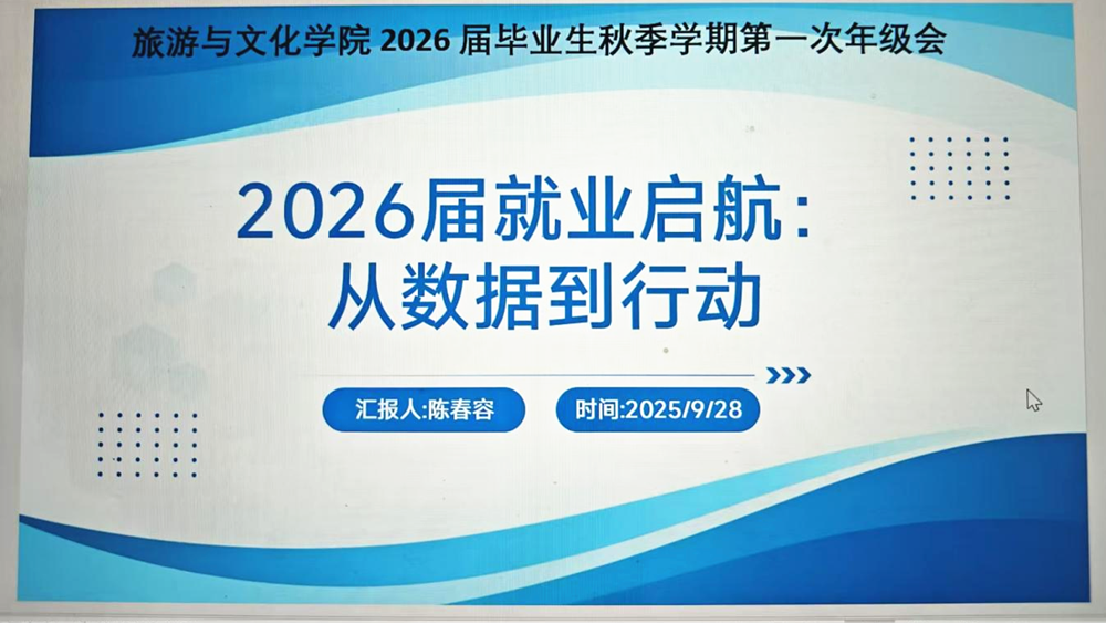 为切实做好2026届毕业生就业指导工作,帮助毕业生明确就业方向、提升服务实效,助力毕业生高质量就业。9月28日晚,旅游与文化学院召开主题为“以数据为基,以行动启航”2026届毕业生秋季学期就业推进会。学院2026届全体毕业生和班主任参会,会议由年级辅导员陈春容老师主持,学院副书记黄珍作总结讲话,同时邀请2022届优秀校友黄丽霏分享求职与职场成长经验。