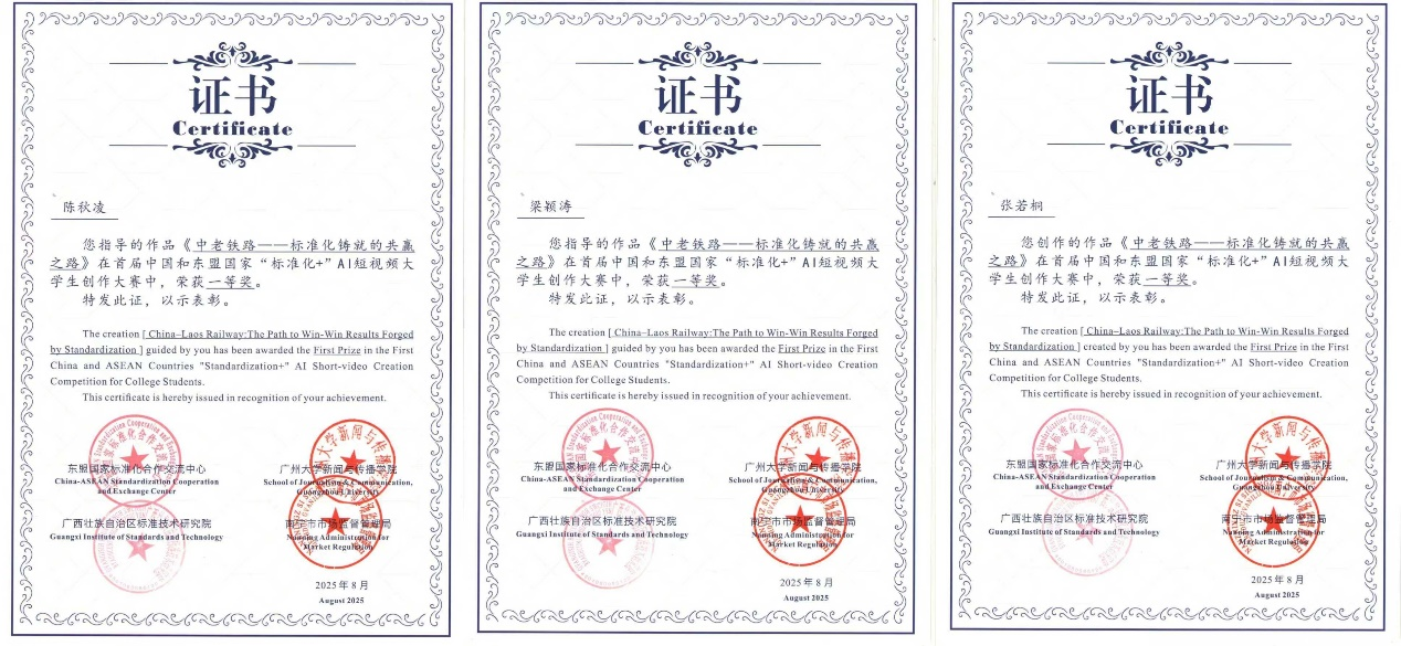 近日,首届中国-东盟国家“标准化+”AI短视频大学生创作大赛圆满落幕,获奖名单正式揭晓,新闻与传播学院师生凭借深厚的专业素养与创新实践能力斩获佳绩。2024级新闻与传播专业研究生张若桐创作的作品《中老铁路:标准化铸就的共赢之路》荣获大赛一等奖,该作品由学院陈秋凌、梁颖涛两位老师联合指导,充分展现了在新闻传播领域人才培养与学科建设的丰硕成果。