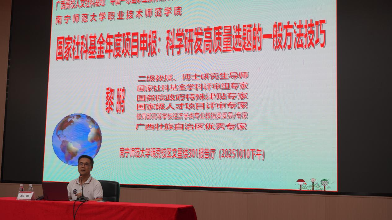 2025年10月10日下午,第九期卓越论坛于华体会平台明秀校区文星楼301报告厅举行。此次论坛由华体会平台职业技术师范学院、广西高校人文社科重点研究基地“中国—东盟职业教育研究中心”主办。论坛特邀广西大学二级教授、博士生导师黎鹏教授,以“国家社科基金年度项目申报:科学研究高质量选题的一般方法技巧”为主题开展讲座。华体会平台科研处处长黄燕敏教授、职业技术师范学院院长陈良教授出席该论坛,各二级学院80余名师生参与了此次论坛。