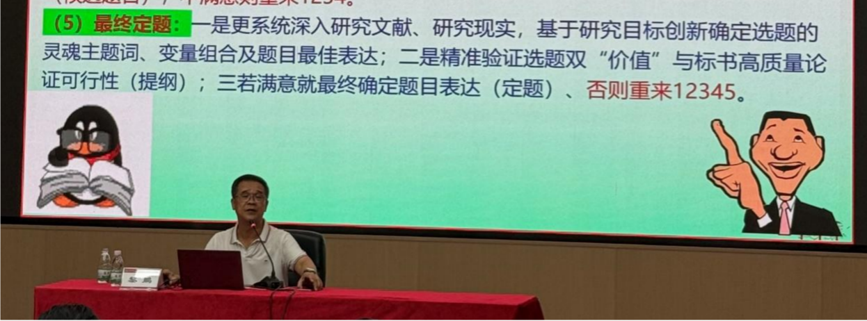 黎鹏教授围绕“为何选题重于论证、如何以端正态度开展高质量选题、如何选准申报项目类别与学科、如何开展高度创新的选题研发、如何优化选题表达”五个方面,深入浅出地阐述了科学开展高质量研发选题的方法。黎鹏教授着重强调了研发高质量选题的“五步法”。其一,基于个人专业素养与研究成果,奠定良好开端;其二,契合国家重大现实需求与学科理论前沿,明确正确方向;其三,精准锁定科学问题与实践问题,确定目标;其四,经过严格验证,初步拟定选题;其五,精心打磨题目表达,最终确定选题。