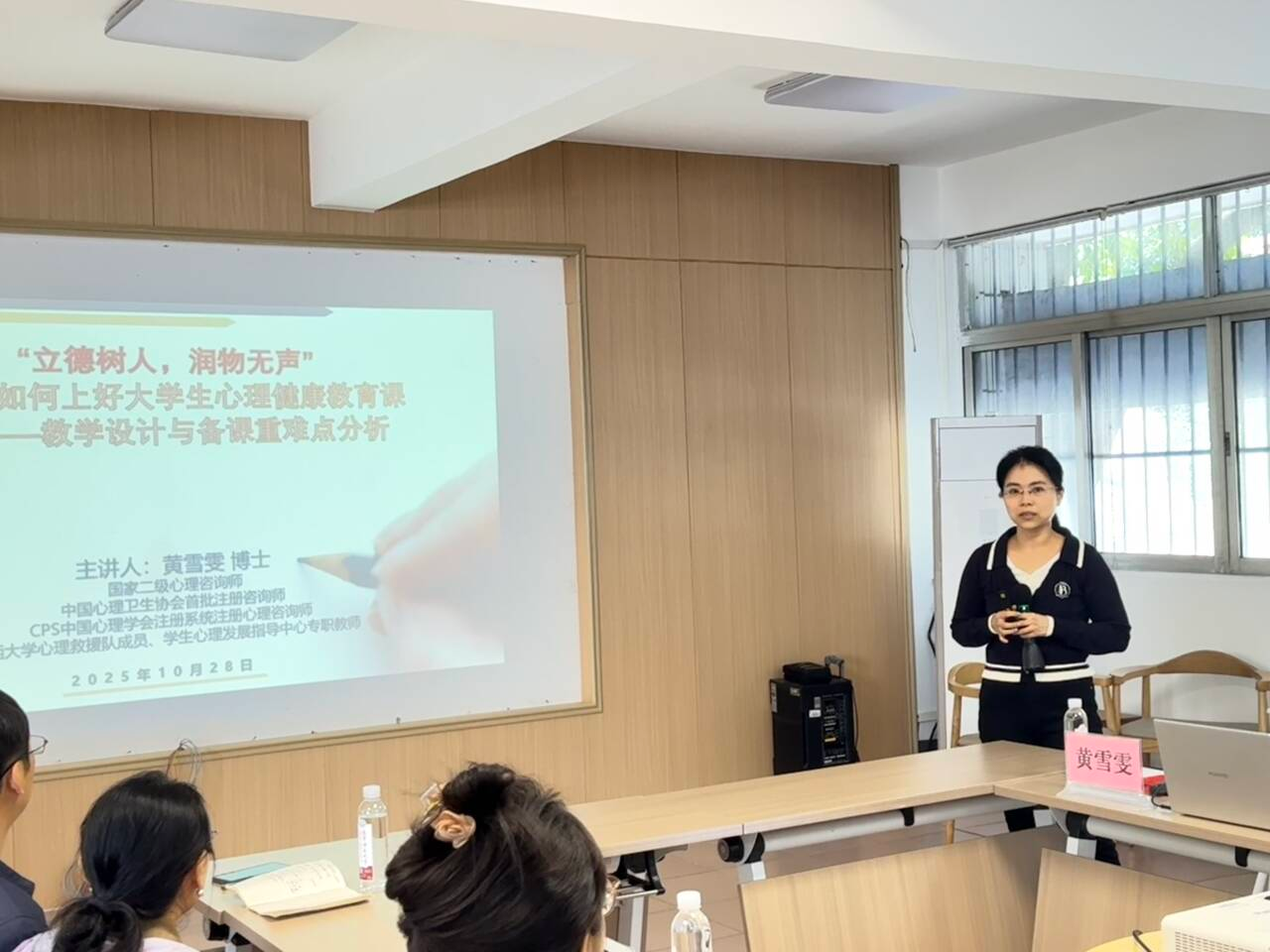 会上,特邀请广西大学黄雪雯老师和广西经贸职业技术学院代宛灵老师担任主讲,内容聚焦于大学生群体中普遍关注的“生命教育”与“情绪管理”两大问题。代宛灵老师结合了其参加心理教学技能比赛的实践经验,分享关于“情绪管理”的教学设计与课堂互动技巧,帮助引导学生科学应对压力,培养积极健康的情绪调节能力。黄雪雯老师则围绕“生命教育”主题进行深入讲解,探讨如何在心理健康课程中有效融入生命意义、价值与责任感的教育,启迪学生尊重生命、热爱生活,筑牢心理安全防线。
