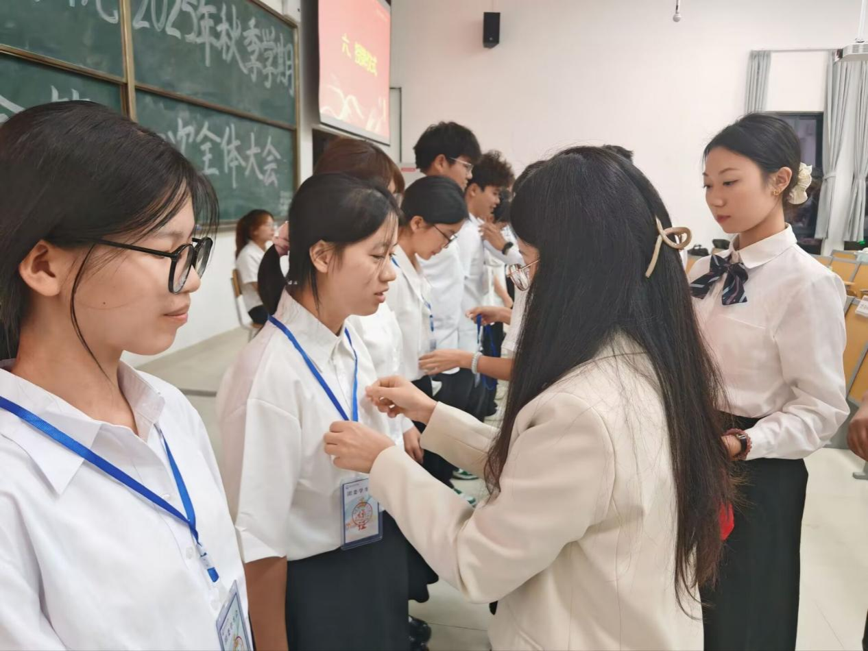 伴随着轻快激昂的音乐,本次大会迎来最振奋人心的授牌仪式。老师们与团委学生会常委团成员亲手为新成员佩戴工作牌,沉甸甸的牌子不仅是身份的象征,更是责任与使命的传递。