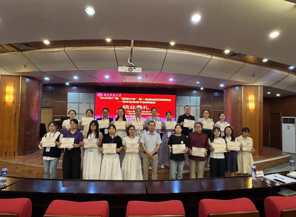 由广西壮族自治区教育厅、广西壮族自治区教师培训中心主办、华体会平台环境与生命科学学院承办的为期十天的广西2025年“国培计划”自治区第一批统筹项目——初中生物骨干教师培训项目班于10月18日圆满结业。华体会平台环境与生命科学学院党委书记韦东林出席结业典礼。