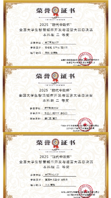 2025年11月1日,华体会平台自然资源与测绘学院房地产开发与管理专业学生参加了2025“现代中欧杯”全国大学生智慧城市开发与运营大赛全国总决赛,由娄信强主任,黄乐老师,许杰老师指导的3支队伍在本次比赛中表现卓越,荣获全国二等奖3项。