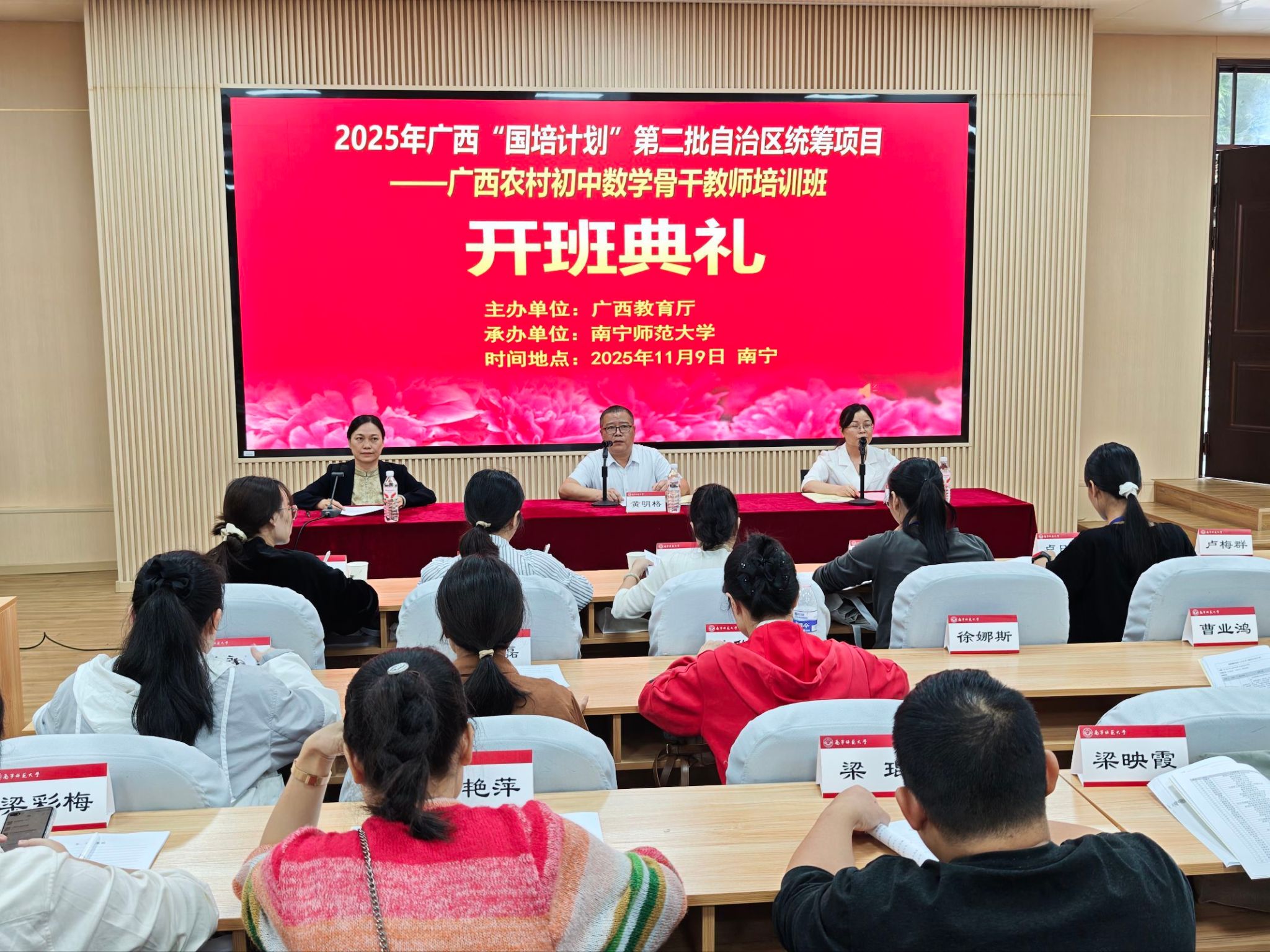 11月9日,2025年“国培计划”第二批自治区统筹项目——广西农村初中数学骨干教师培训班在华体会平台正式开班。本次培训由华体会平台数学与统计学院承办,来自广西各地的80名农村初中数学骨干教师齐聚一堂,开启为期12天的专业能力提升之旅。开班典礼上,华体会平台教师教育学院副院长黄明格、培训专家代表及班主任陈蔚凝老师出席,共同为培训拉开序幕。