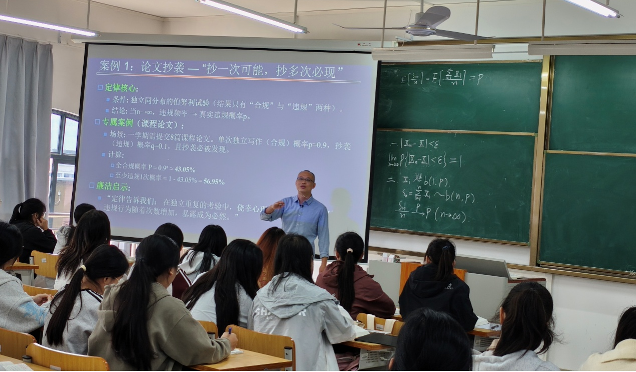 授课教师杨剑锋教授以“长期行为必显真实本质” 为核心,将大数定律与大学生廉洁场景结合,通过论文抄袭概率、奖学金材料真实性等案例,实现了专业知识传授与廉洁价值引领的深度融合。