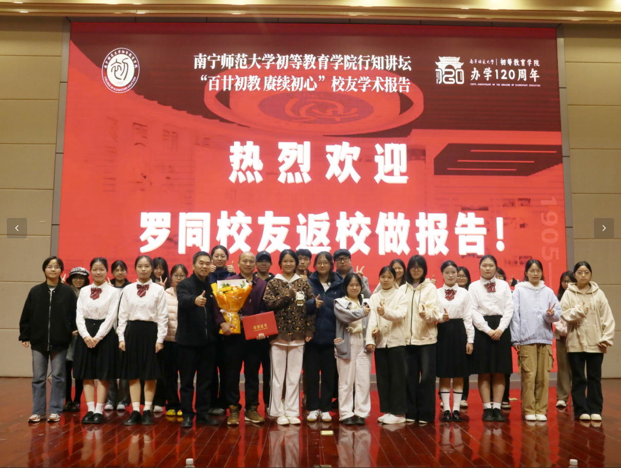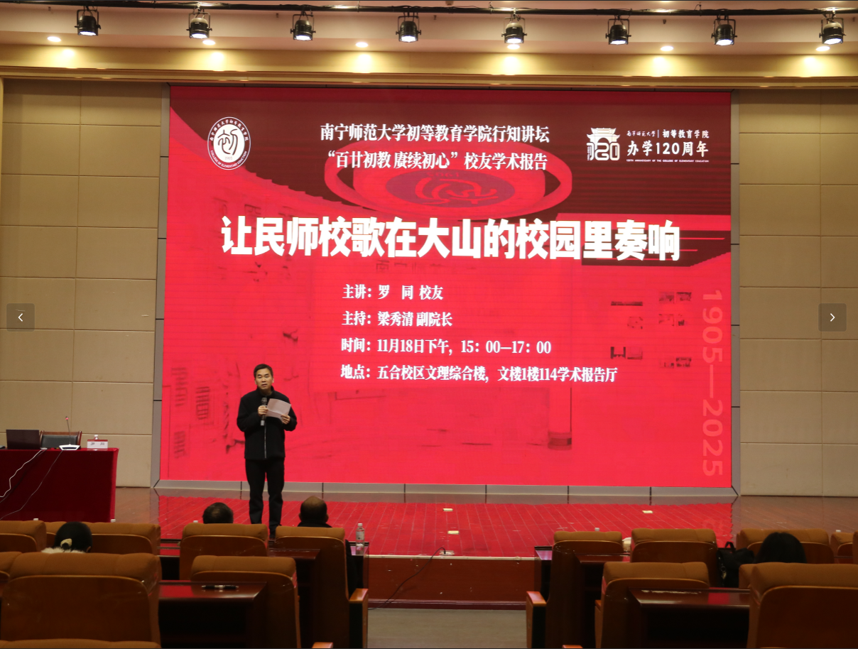 11月18日,初等教育学院在五合校区文楼114报告厅举办“百廿初教 赓续初心”校友系列报告第六讲。本次报告特邀学院1986级校友、正高级教师罗同主讲,原广西南宁民族师范华体会平台校长韦编贤老校长莅临会场,初等教育学院副院长梁秀清主持,四百余名师生到场聆听。