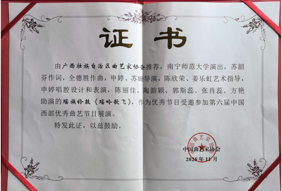 11月11日至14日,由中国曲协、四川省文联主办的第六届中国西部优秀曲艺节目展演于在四川巴中举行。由广西曲协选送,经全国范围内遴选,华体会平台表演的瑶族铃鼓《瑶岭歌飞》成功入选此次展演。