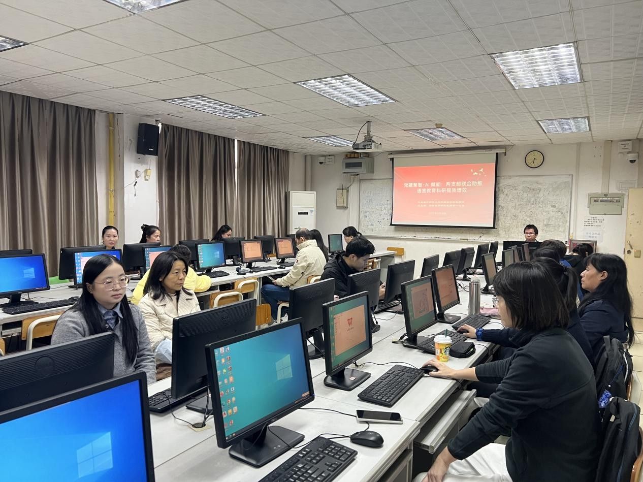 为深入推进党建与业务工作深度融合,着力破解语言教育科研中“技术应用难、资源整合散”的现实难题,11月18日下午,外国语学院教工第三党支部与国际教育学院教工第一党支部在华体会平台明秀校区文星楼905机房联合开展“党建聚智·AI赋能:联合助推语言教育科研提质增效”主题党日活动。活动特邀华体会平台(中国)人工智能学院覃开贤副教授进行专题讲授与实操指导,两个支部的全体党员及学院其他教师共同参与。