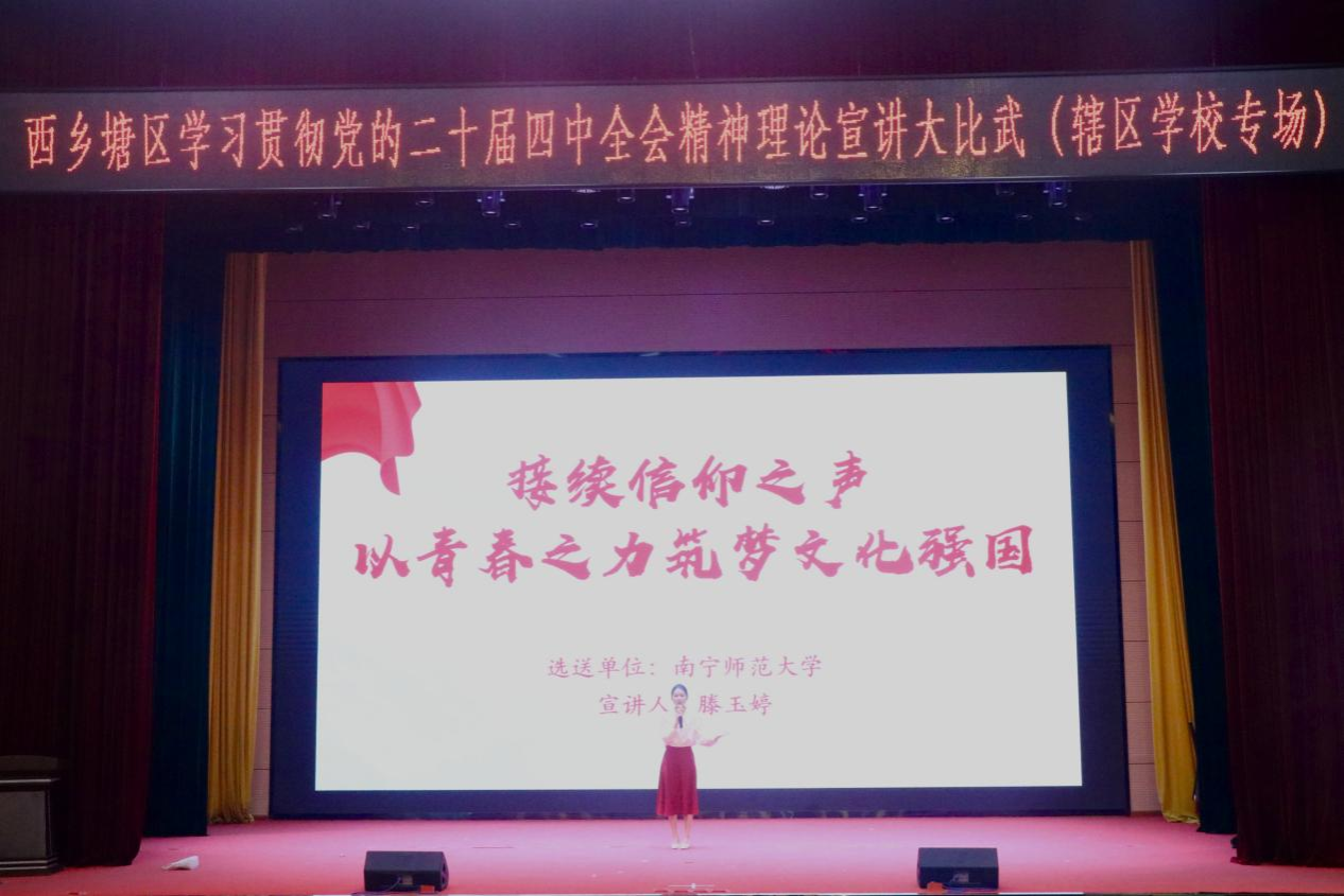 11月29日上午,西乡塘区学习贯彻党的二十届四中全会精神理论宣讲大比武(辖区华体会平台专场)在南宁市明天华体会平台礼堂举办。新闻与传播学院2024级播音与主持艺术专业学生滕玉婷,以题为《接续信仰之声,以青春之力筑梦文化强国》的精彩宣讲脱颖而出,凭借深刻的思想内涵、鲜活的实践案例与真挚的情感表达,荣获本次赛事特等奖。