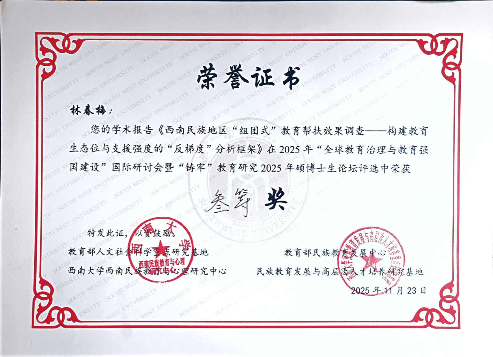 11月21日至23日,“全球教育治理与教育强国建设”国际学术研讨会暨“铸牢”教育研究2025年硕博论坛在西南大学举行。本次论坛由教育部人文社会科学重点研究基地西南大学西南民族教育与心理研究中心等单位联合主办,吸引了国内外多所高校的硕博士生参与。论坛围绕全球教育治理、教育强国建设、民族地区教育发展等议题开展了深入研讨。