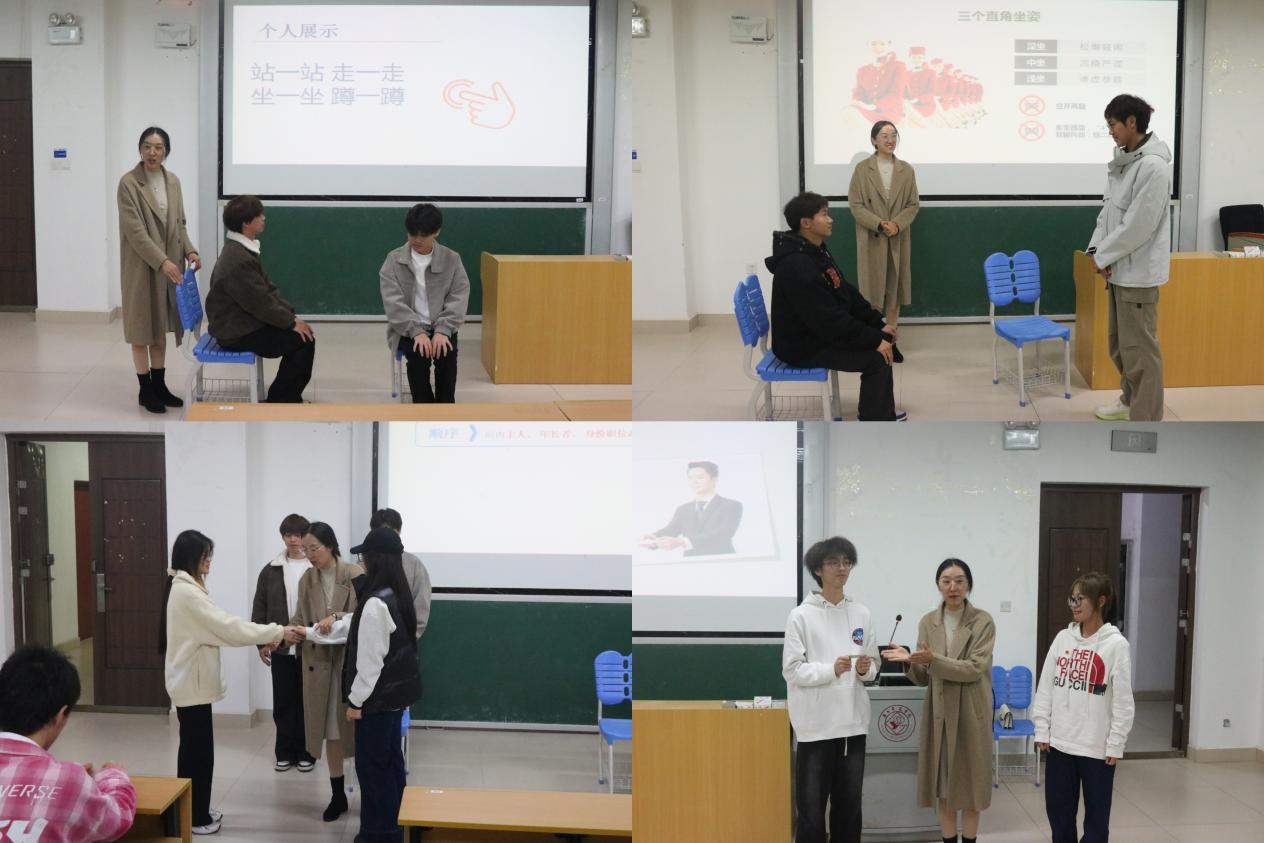 培训伊始,李樱花老师以 “秀才与无赖” 的生动故事开篇,巧妙阐释了礼仪素养对个人形象塑造、人际关系协调的重要意义。随后,她围绕个人形象规范、社交礼仪原则、学生干部素养标准三大核心板块展开系统讲解。在个人形象规范部分,李老师以传统 “九容” 仪态标准为基础,并通过现场示范、互动演练的方式,让学员们直观感受规范仪态的魅力,亲身体验动作调整后的变化。