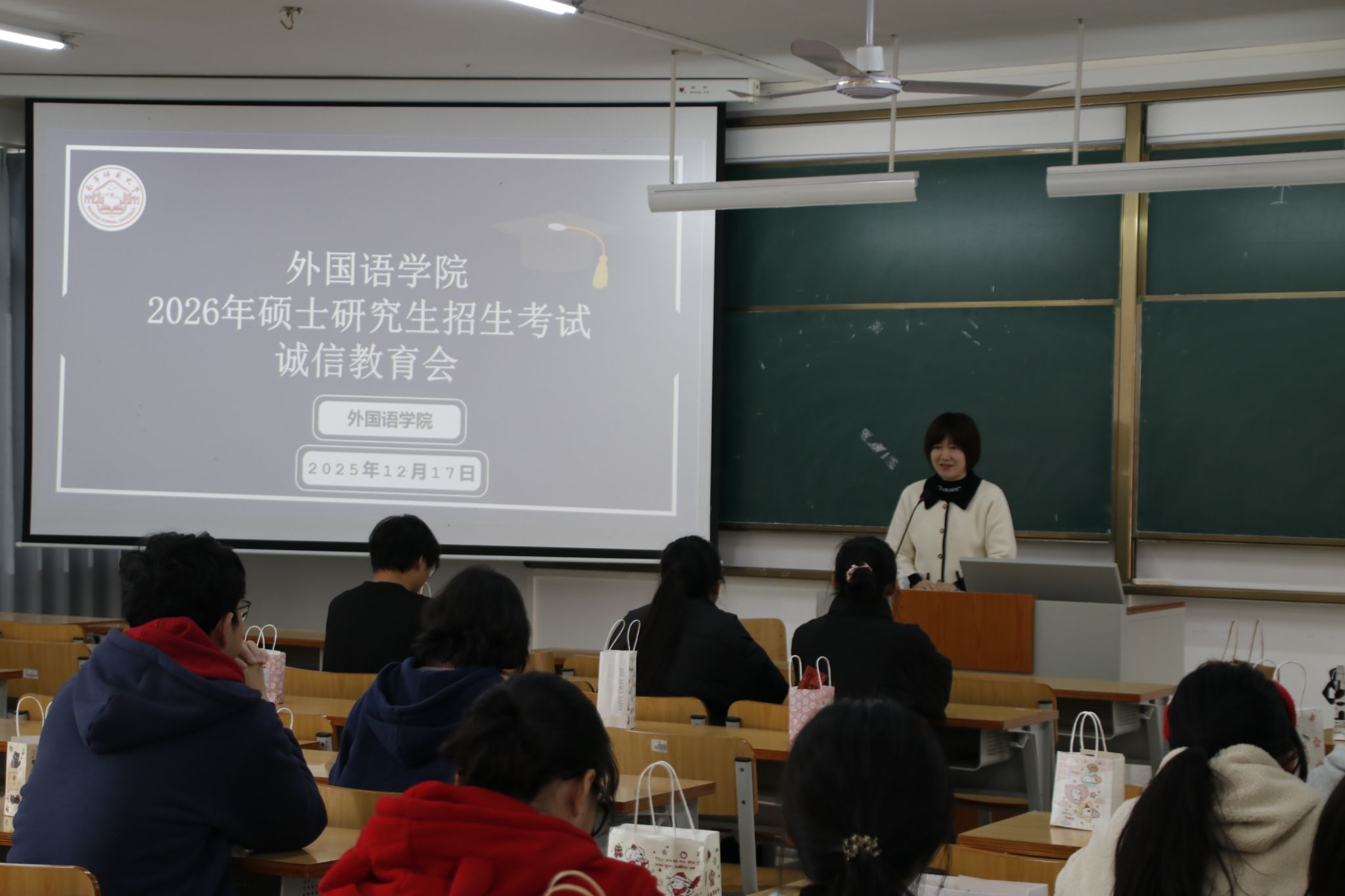 为深入推进诚信教育,营造风清气正的考试环境,保障2026年全国硕士研究生招生考试平稳有序进行,12月17日中午,外国语学院在武鸣校区实验楼2C-203教室组织召开了考研诚信教育暨考前动员大会。学院党委副书记邱晖、学工办张新举老师出席会议,外国语学院全体考研学子参会。