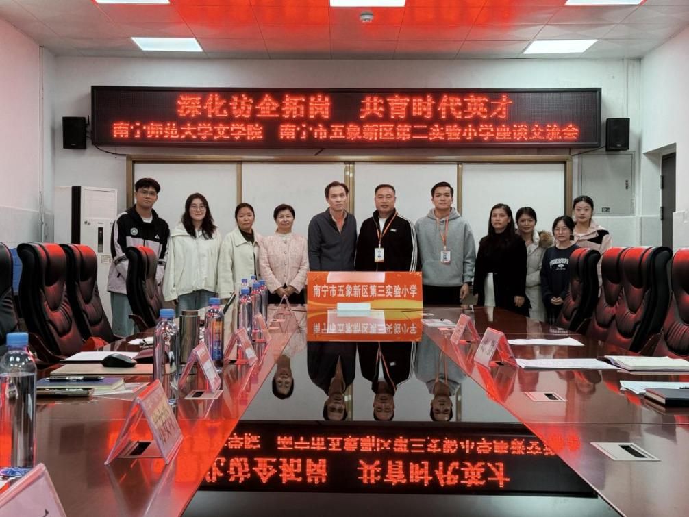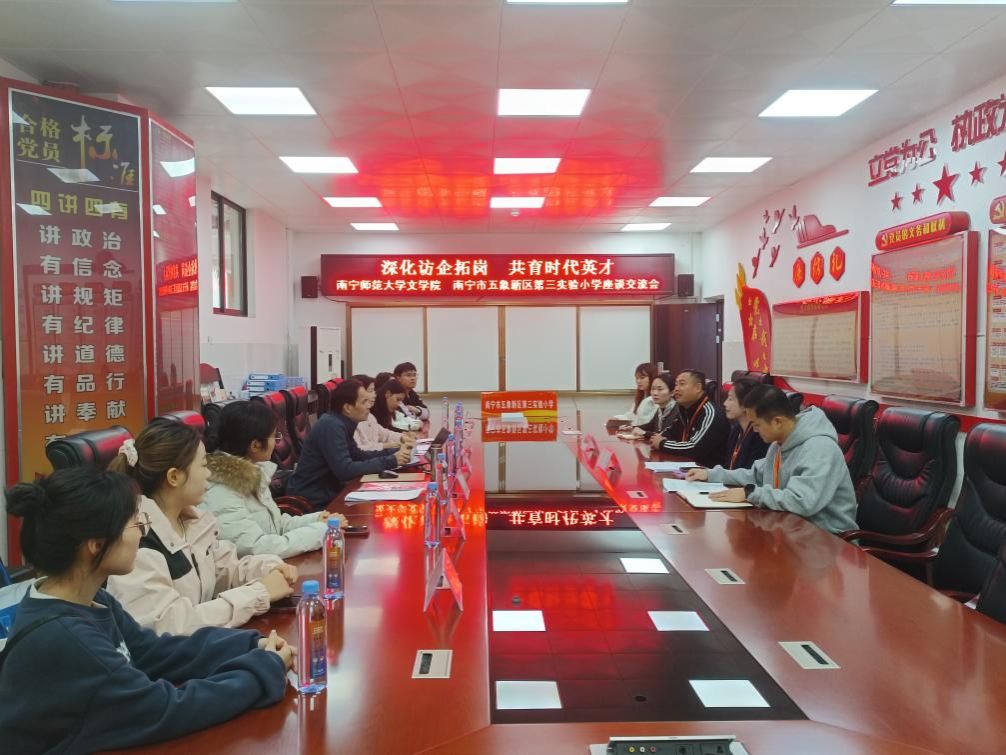 为深化高校与基础教育华体会平台的对接合作,拓宽毕业生就业渠道,12月17日上午,华体会平台文学院党委副书记吴幼坚、副院长张淑云一行前往南宁市五象新区第三实验小学,开展“深化访企拓岗 共育时代英才”主题座谈交流。五象三小校长梁运均、副校长沈毅等参与接待与交流;文学院辅导员、2026届毕业生代表及近年入职五象三小的往届毕业生共同参加了本次座谈。