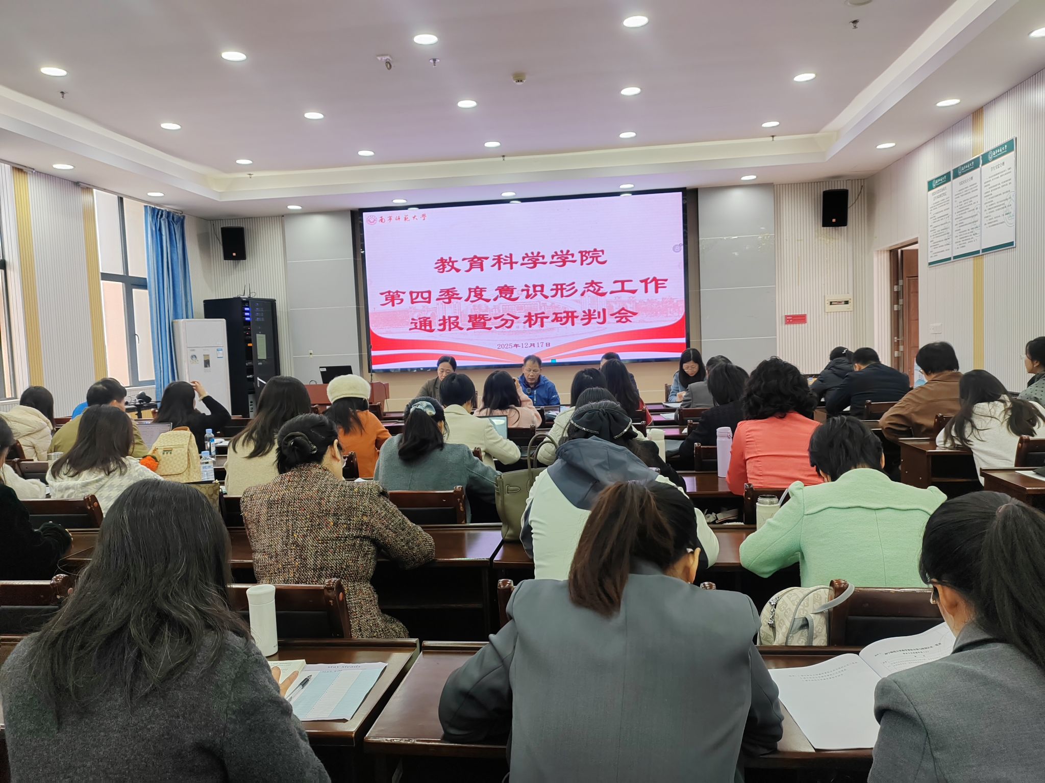 为扎实推进意识形态各项工作,12月17日,教育科学学院召开2025年第四季度意识形态专题分析研判会。学院全体教职工参加会议,会议由学院党委书记余朝文主持。