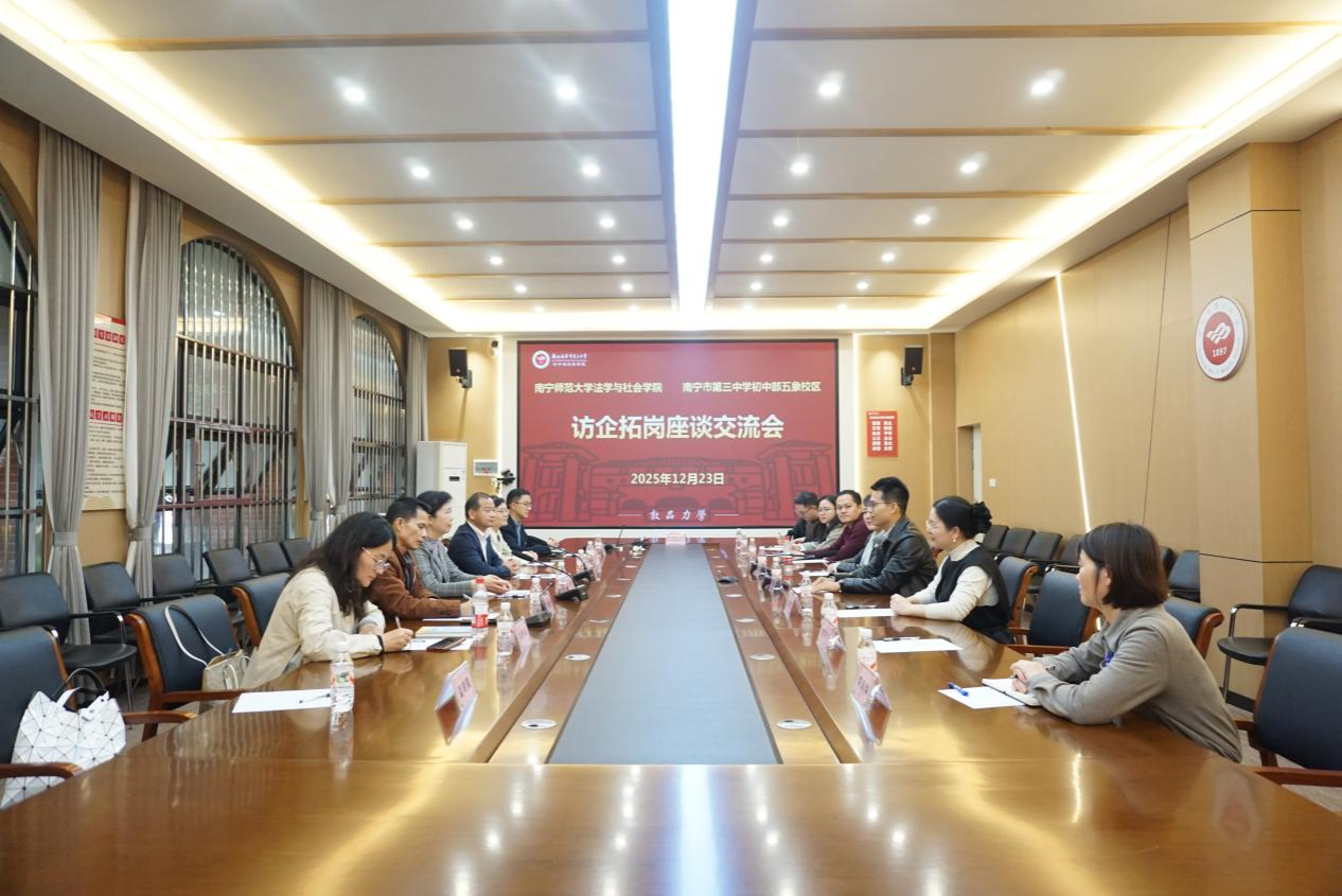活动仪式后,随即召开了“访企拓岗”专题座谈交流会,推动合作走向深入务实。许建、吴少进、罗永仕等与南宁三中代表,围绕社会工作、法学、历史学等专业学生的实习实践方案、专业能力培养、学生实习就业对接等内容展开广泛而深入的对话。此次座谈为后续将合作协议细化为具体可行的教学与实践方案奠定了坚实基础,也为相关专业学生拓展了高质量的实践与就业平台。